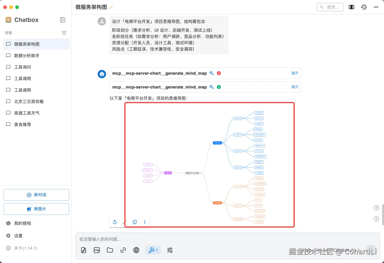 下面我们尝试生成思维导图:我们这里借助 @antv/mcp-server-chart 它也支持生成思维导图: