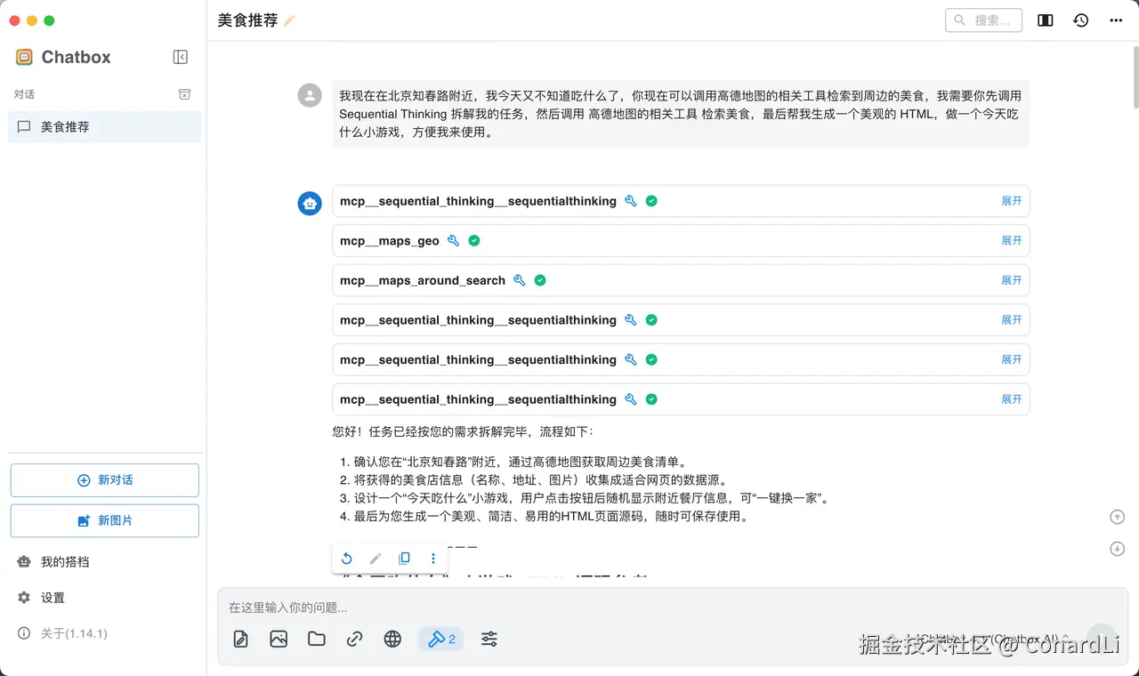 提示词:我现在在北京知春路附近,我今天又不知道吃什么了,你现在可以调用高德地图的相关工具检索到周边的美食,我需要你先调用 Sequential Thinking 拆解我的任务,然后调用 高德地图的相关工具 检索美食,最后帮我生成一个美观的 HTML,做一个今天吃什么小游戏,方便我来使用。