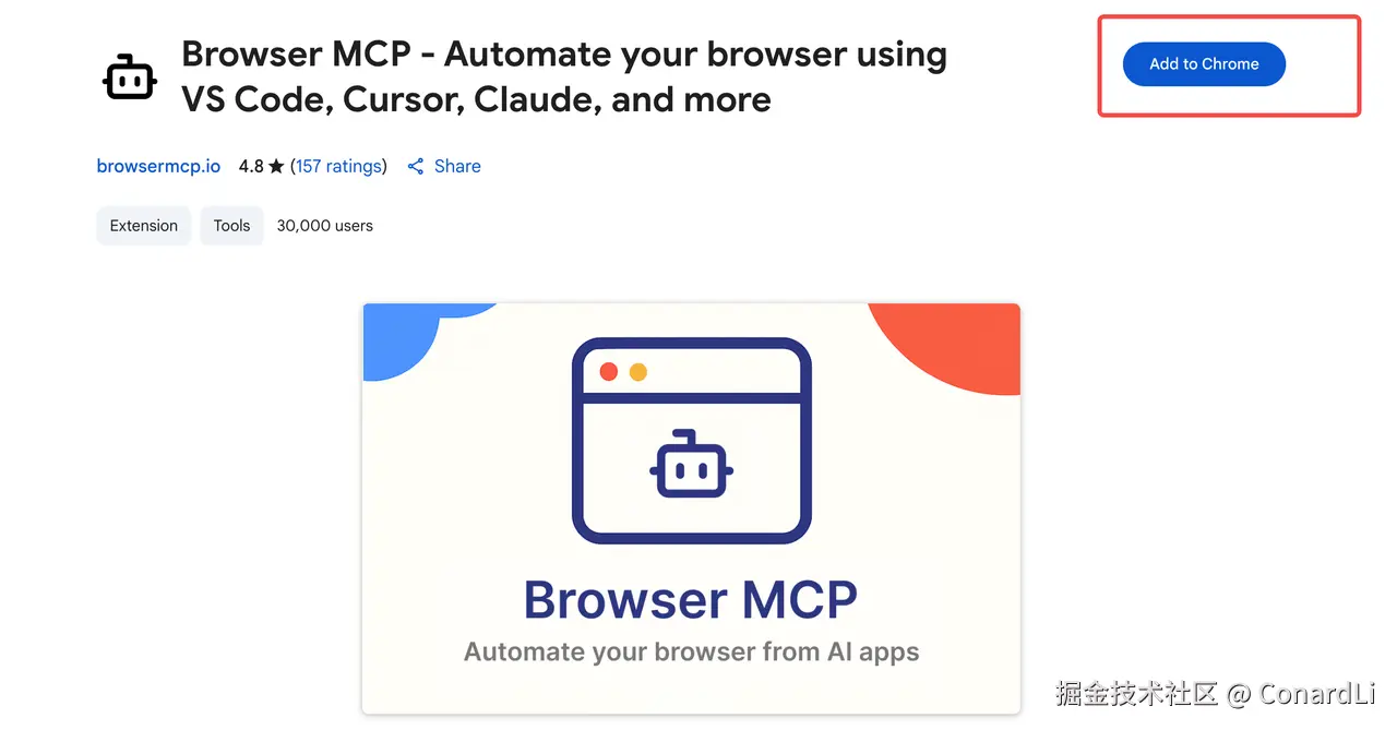 然后这个 MCP 需要配合一个 Chrome 插件使用,进入 chromewebstore.google.com/detail/brow… Add to Chrome: