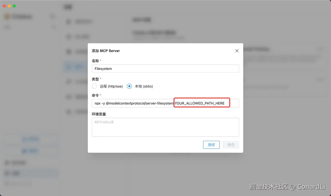 点击之后,将 YOUR_ALLOWED_PATH_HERE 替换为你允许 AI 访问的本机目录