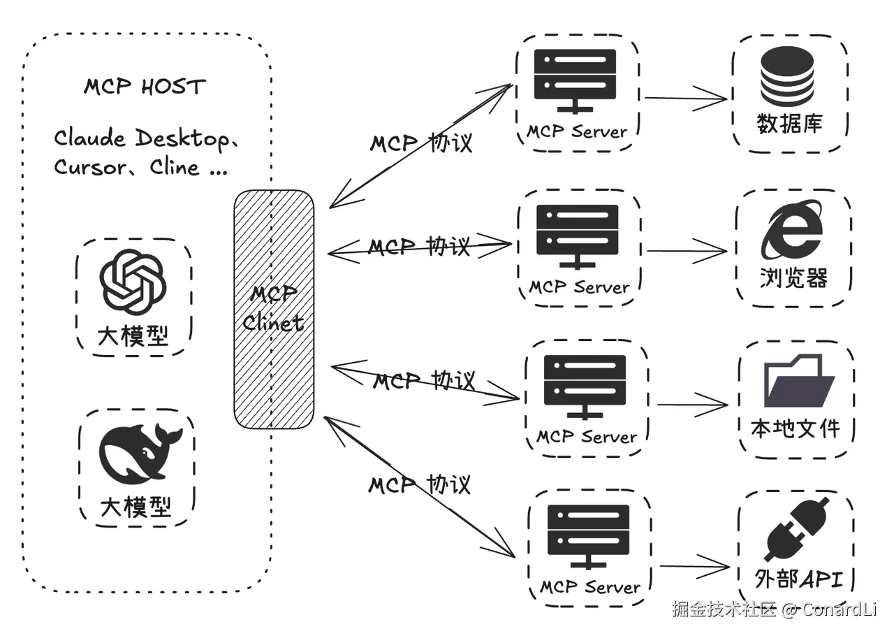 MCP就像是一个 “通用插头” 或者 “USB 接口”,制定了统一的规范,不管是连接数据库、第三方 API,还是本地文件等各种外部资源,都可以通过这个 “通用接口” 来完成,让 AI 模型与外部工具或数据源之间的交互更加标准化、可复用。相当于给本来只具备基础对话能力的大模型插上了翅膀,能够完成很多之前做不到的事。