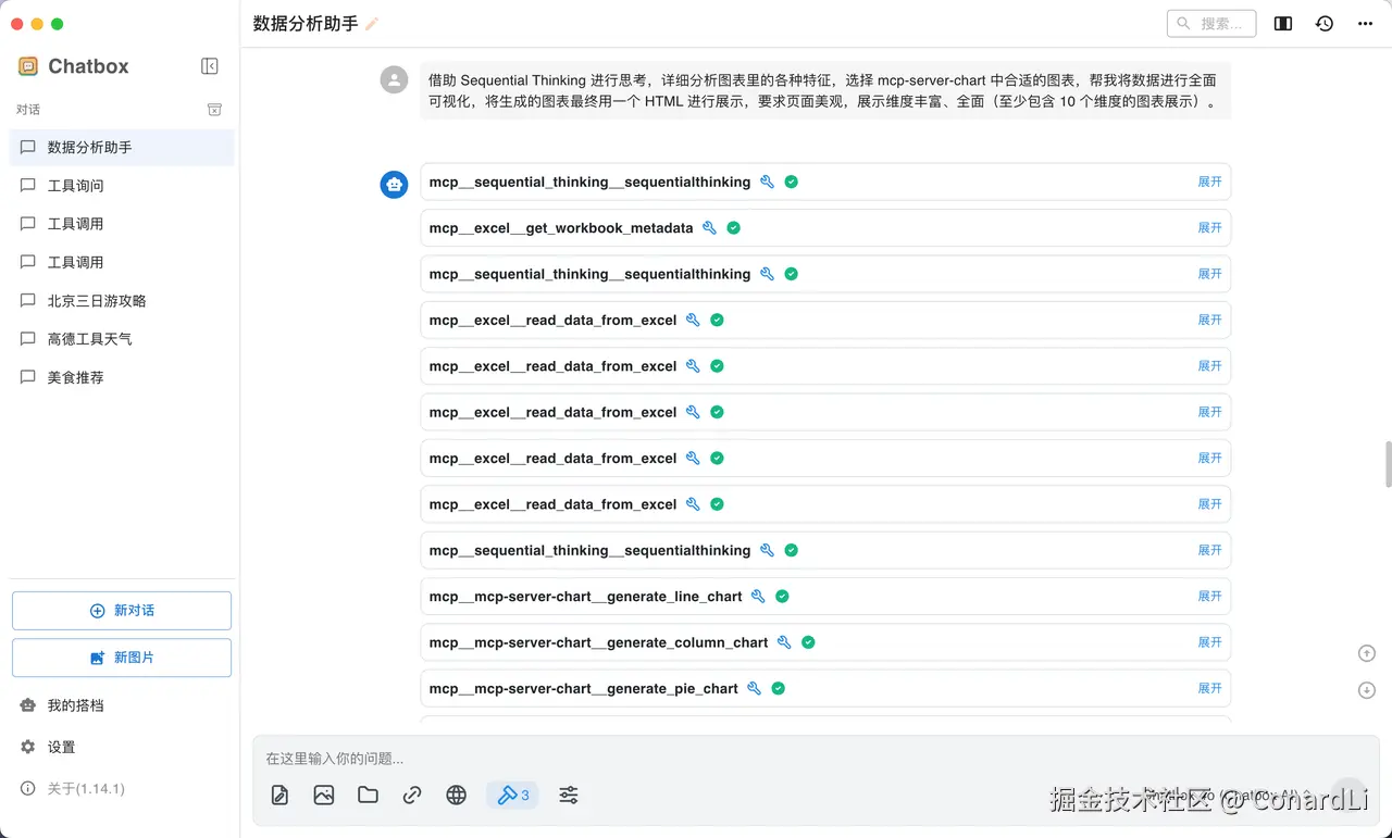在我之前的教程有讲过 MCP 的交互原理:《全网最细,一文带你弄懂 MCP 的核心原理》,让模型结合 MCP 去完成一个任务时,一般中间需要多轮的交互,模型一般需要先完成一个步骤后再考虑下一个步骤需要做什么,任务如果比较复杂,这个过程会不太稳定,所以当我们的任务较为复杂时,建议结合 Sequential Thinking 使用,它会先帮模型规划好完整一个任务一共要分几步,然后分步骤指导模型后续的动作,可以让整个任务完成的有规划、更稳定,比如我们本次的任务通过下面的提示词一次就完成了: