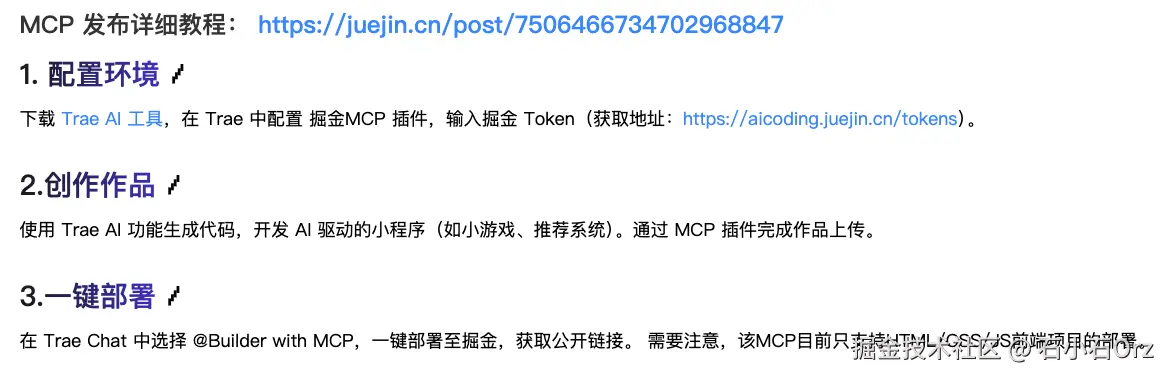 部署前,我们需要先配置掘金的MCP,在 Trae 或 IDE 的 MCP 配置中,添加以下 JSON 配置: