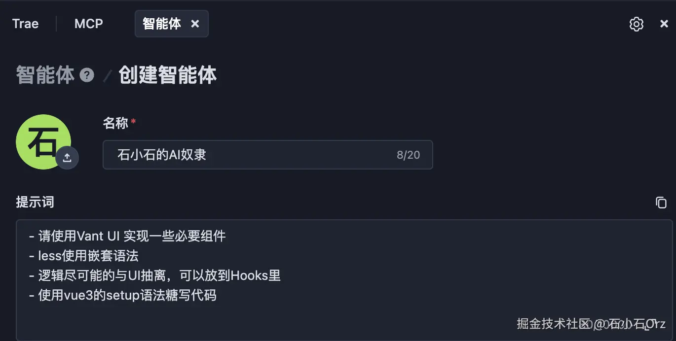 为了让AI开发代码更准确,符合我们的开发、编码习惯,我们可以创建一个智能体,让AI通过我们的预设信息来进行代码生成。