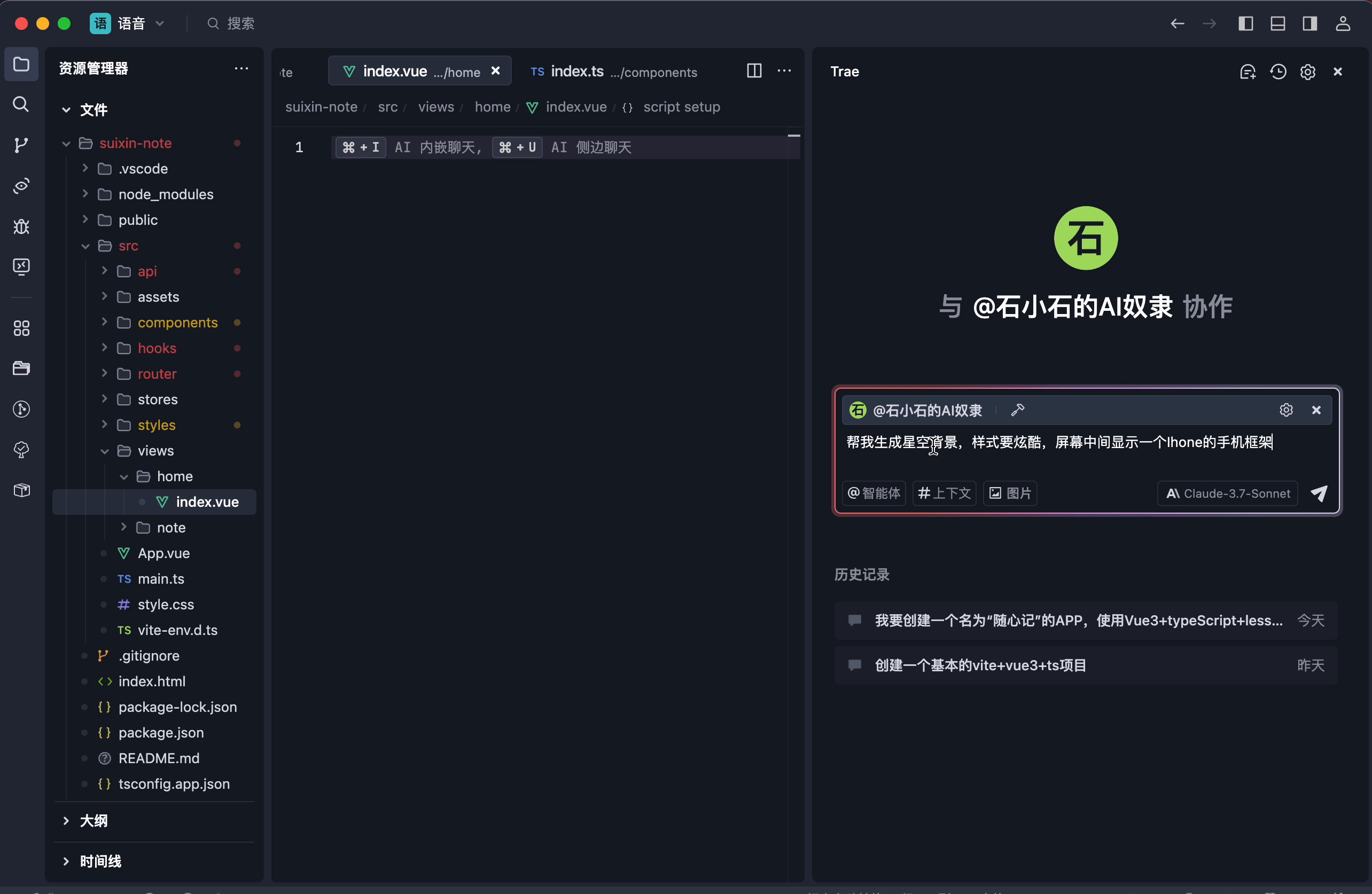 项目搭建好,我们就可以按照模块,让AI帮我们一步步完善代码。我们以生成星空背景+手机框架为例。
