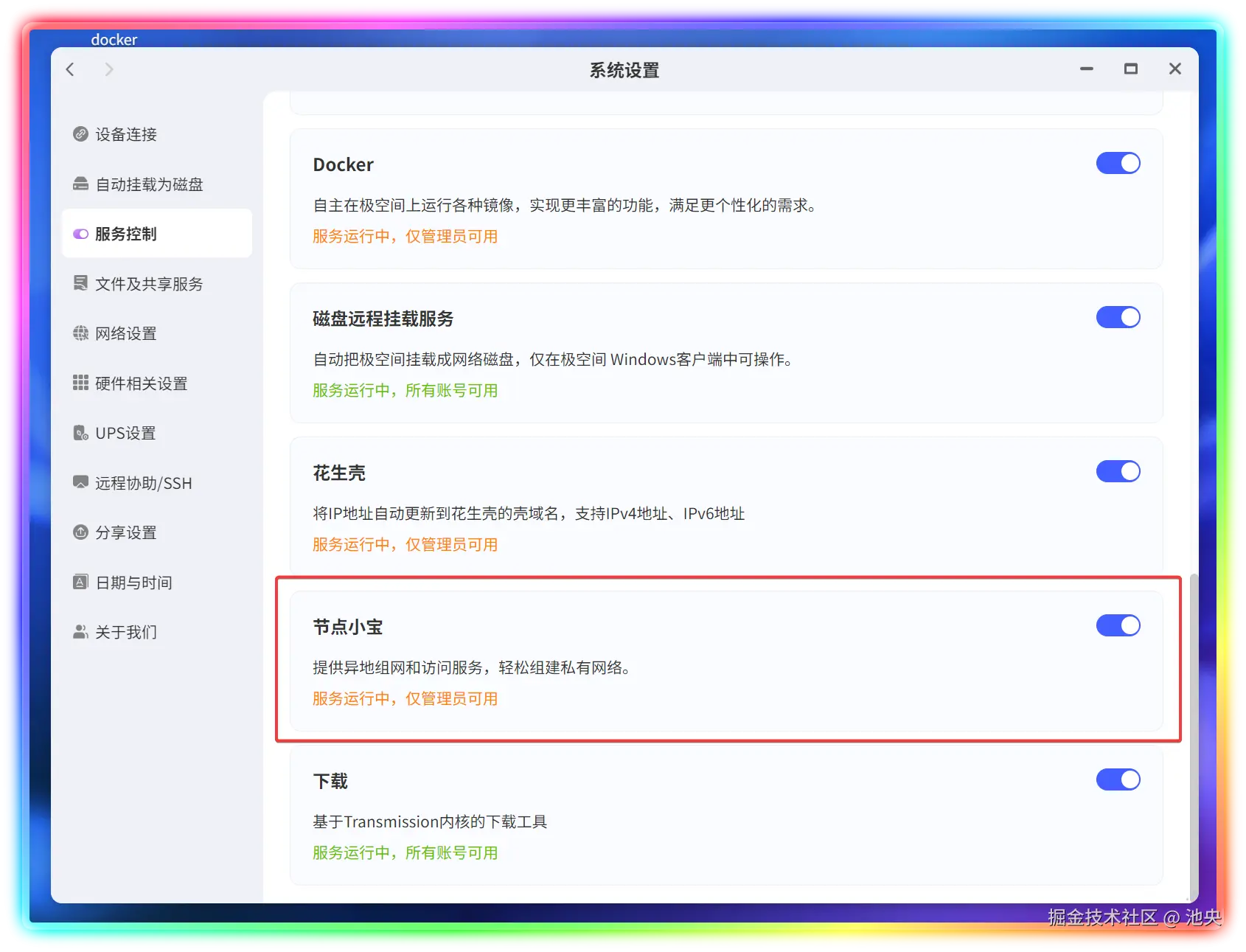 极空间是最简单的,直接系统就内置了节点小宝,只需要在服务控制中打开即可。