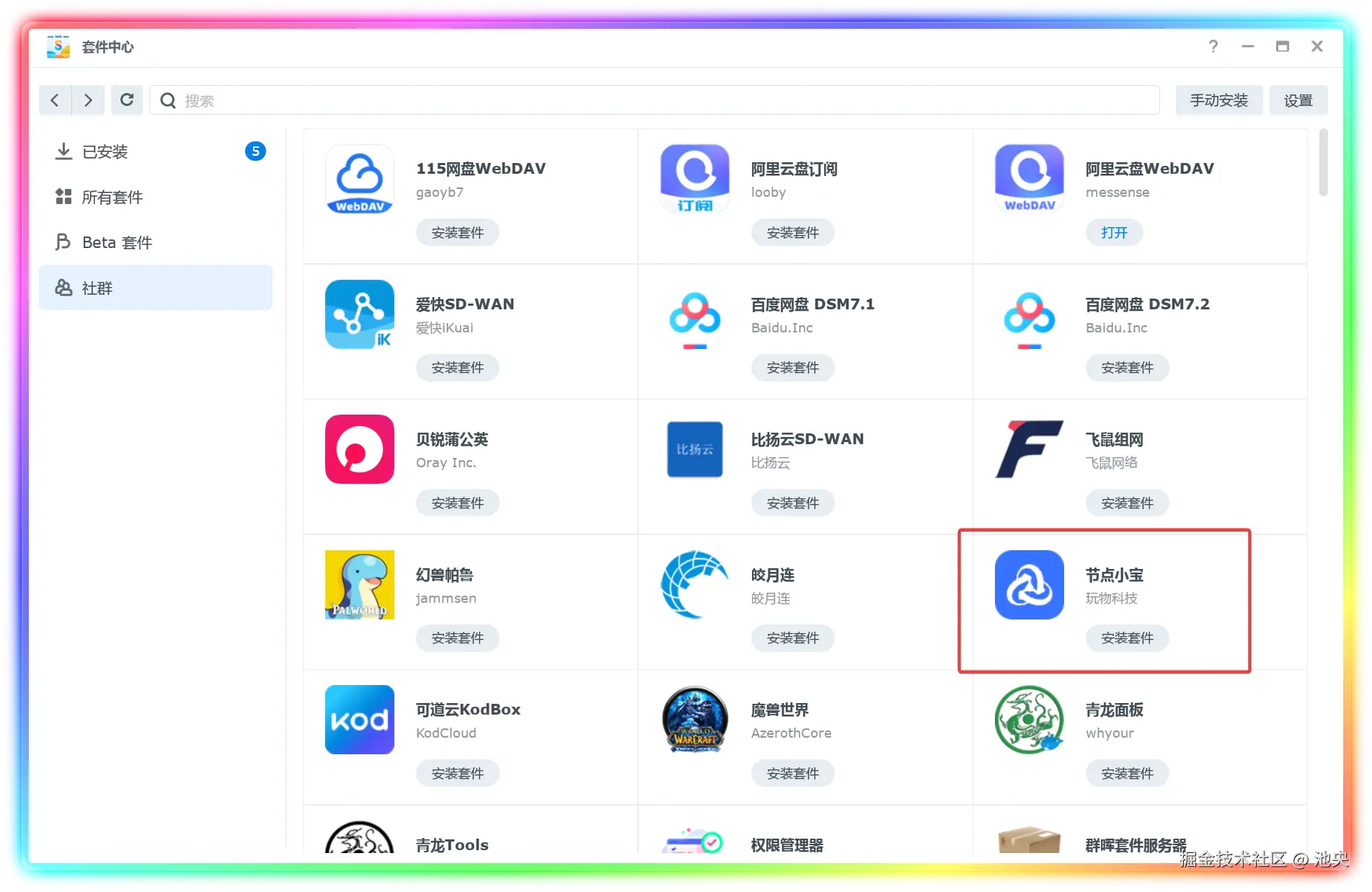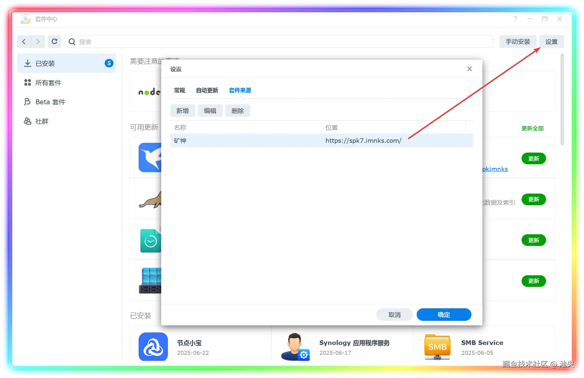 ▼群晖需要自行安装,最简单的方式 - 套件中心启用矿神套件源