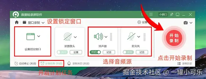 步骤2:选择锁定的窗口,勾选准备录制的音频源。如果你有别的事要忙,可以直接设置 “计划录制任务” ,它会根据你的设置自动开始和结束录制。