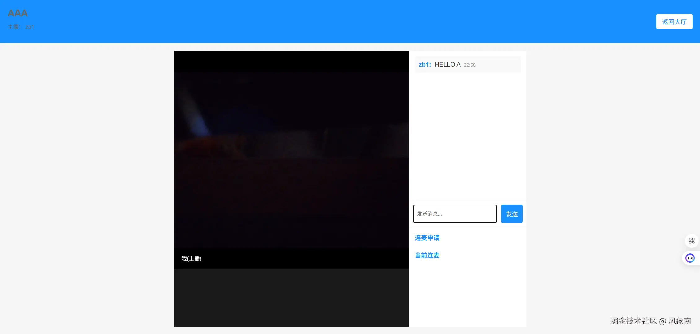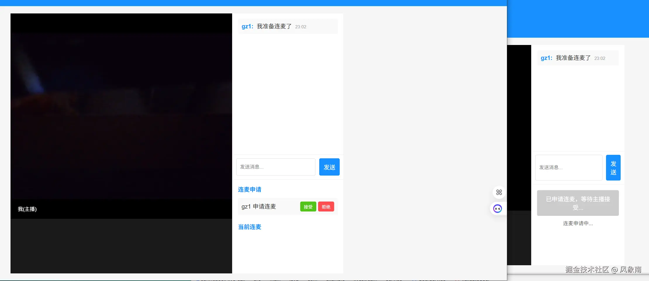 新打开另一个浏览器窗口(注意不是多个TAB,是独立的浏览器窗口),输入账号 gz1, 密码 gz1登录系统,进入直播间,申请连麦