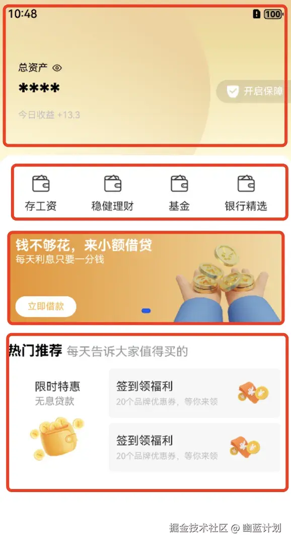 有了清晰的思路接下来就可以每个部分逐个击破,最顶部的资产部分是有背景图片的,所以我们把图片和内容部分分开来看,每一个部分就都变得很简单了,具体代码如下: