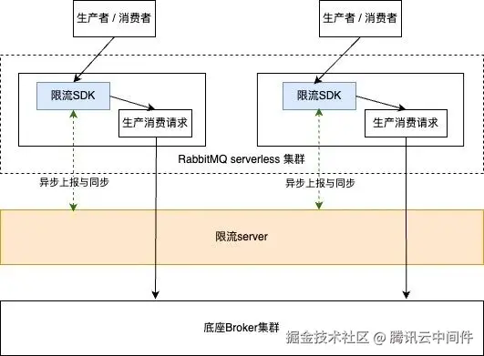 TDMQ RabbitMQ Serverless 版集群内部集成限流 SDK,该 SDK 提供 Token 申请 API,并负责与限流 Server 通信,通过这种集中式 Token 管理实现对核心存储层 (底座 Broker 集群) 的保护。