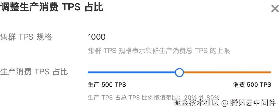 为实现资源隔离与灵活适配的双重目标,系统对发送消息与消费消息的 TPS 配额进行独立分配,并支持用户按需配置配额比例,从而实现精细化资源管理与业务场景的精准匹配(默认配额比例为1 : 1 也即50%)。业务可以根据实际的收发比例进行调整,可调整的收发消息比例范围在20%-80%(服务端支持动态调整该区间)之间。