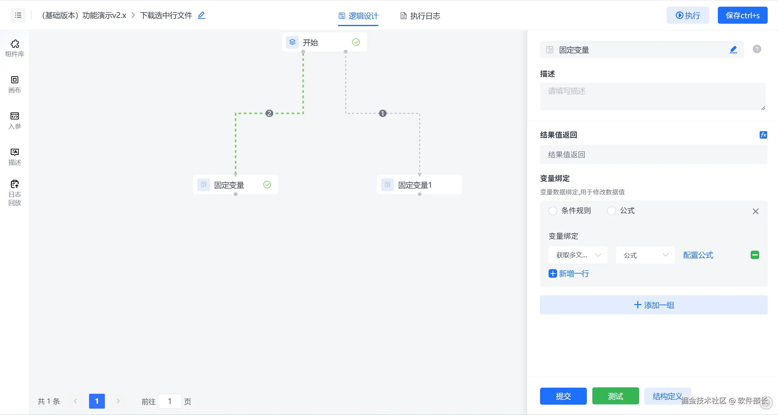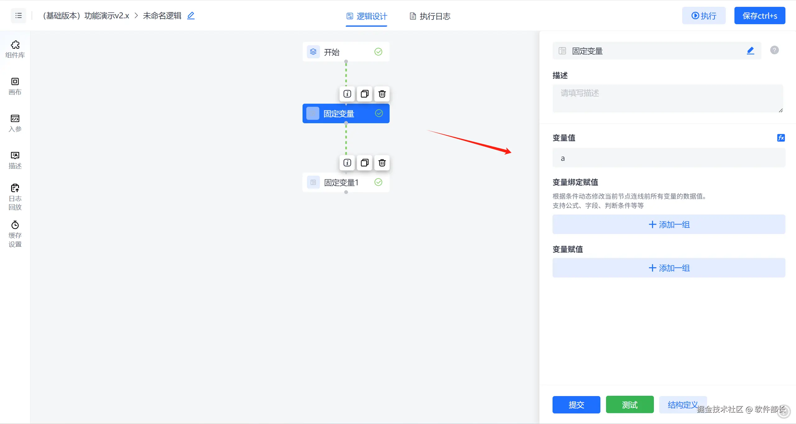 下图:当【定义变量】节点值为a时【定义变量1】节点通过变量绑定赋值成aa。