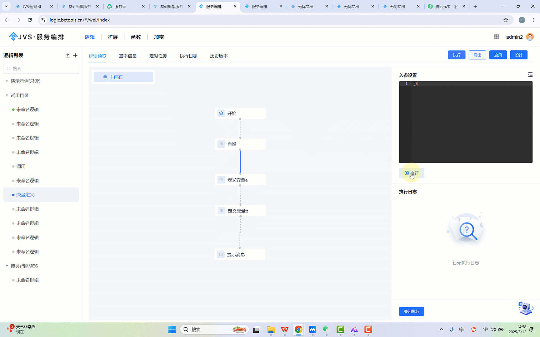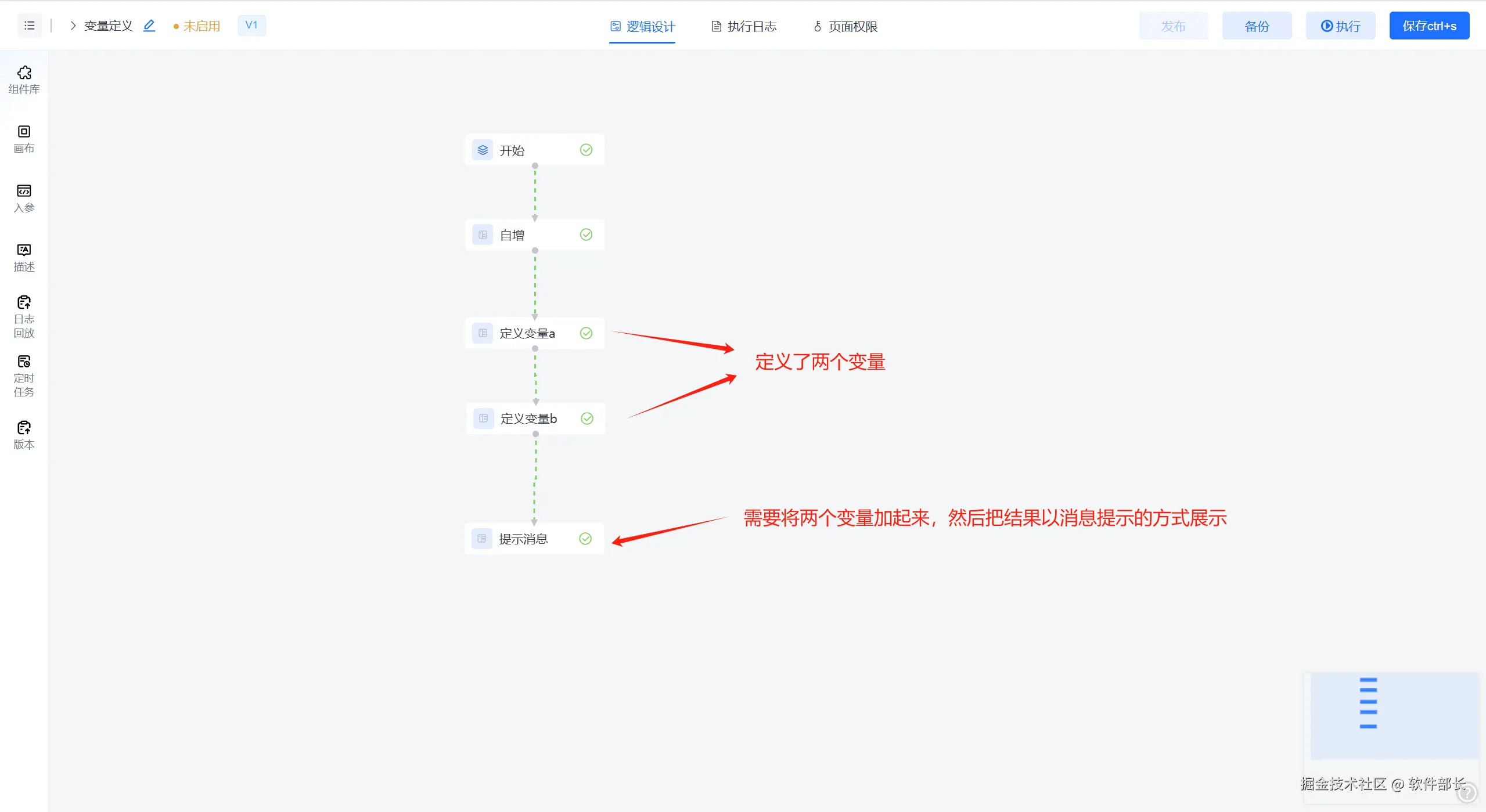 系统通过引入“定义变量”节点 进入配置画布,连接节点的执行线,形成可以执行的任务流程。
