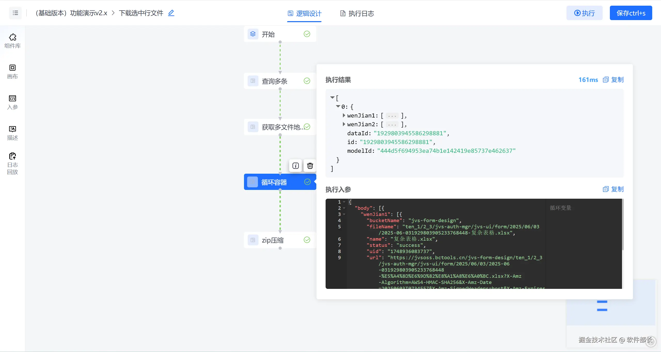 在这样的逻辑中我们通过勾选多条数据点击触发逻辑实现,用【定义变量】节点绑定变量值,使循环节点每执行条数据时就赋次值,然后对每次循环赋值取并集,最后【zip压缩】节点就取定义变量的值。