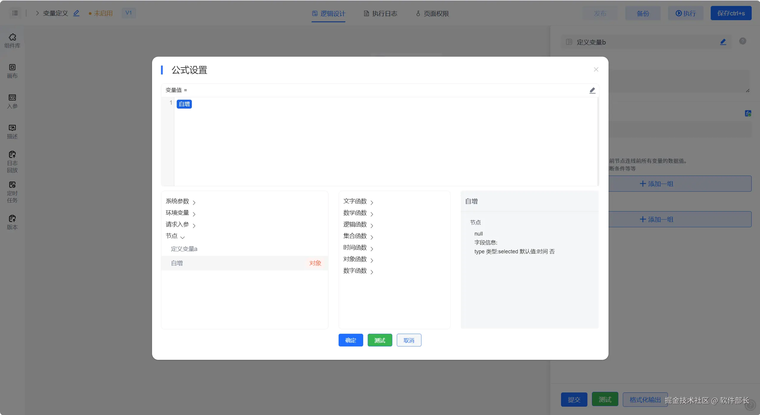 后续环节要引用前序环节输出的变量结果,那么在系统中只需要通过公式配置中 选择使用即可,那么我们看下下面的示例: