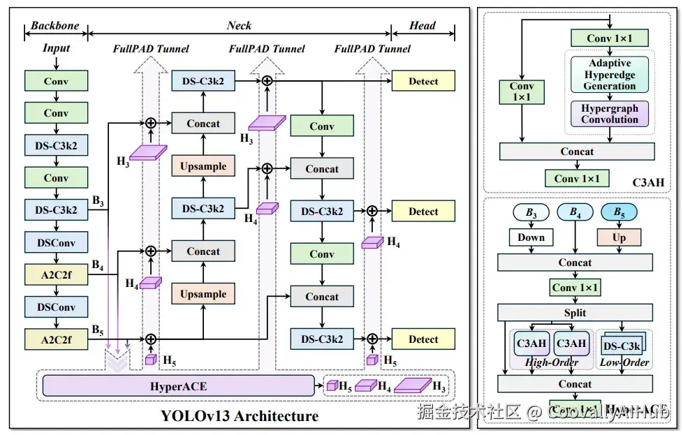 YOLOv13 不再满足于传统的 “Backbone → Neck → Head” 三段式信息流。