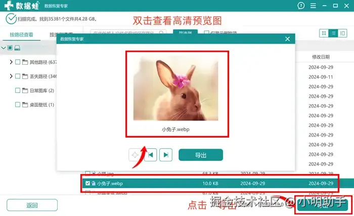 步骤2: 在扫描出来的文件中,图片格式的文件还可以查看高清的内容预览,更方便用户找到目标文件;选中文件后,点击“导出”;