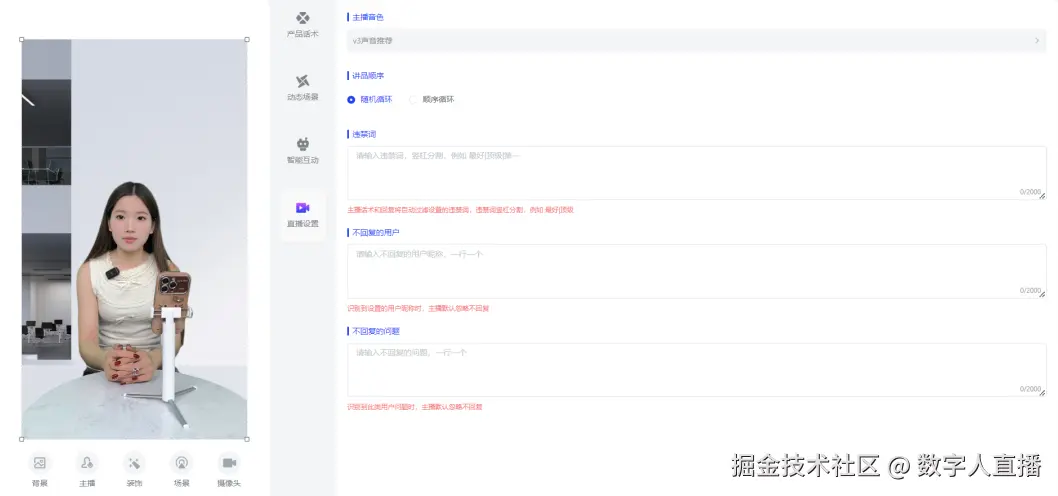 关键词互动:当直播间的用户评论触及预设关键词时,数字人主播会立即进行1V1的自动回复。
