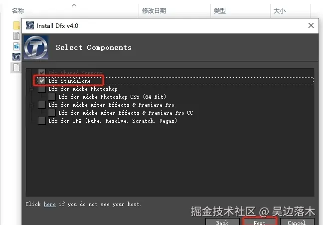 选择组件,注意:如果是CC2015以上版本,安装的时候识别不到PS,勾选 Dfx standlone一下, 然后点击Next