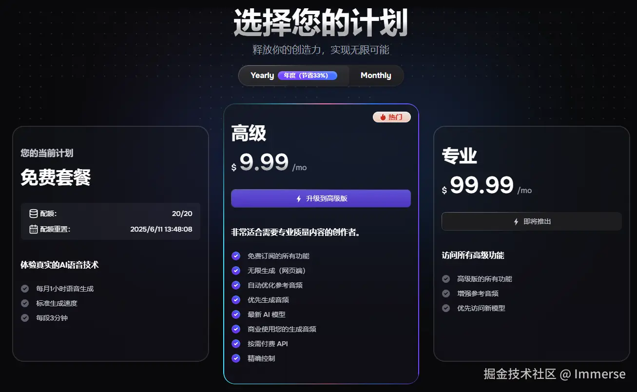 价格上,免费额度每个月有一个小时的额度,会员是 $9.9 每个月且无限生成。