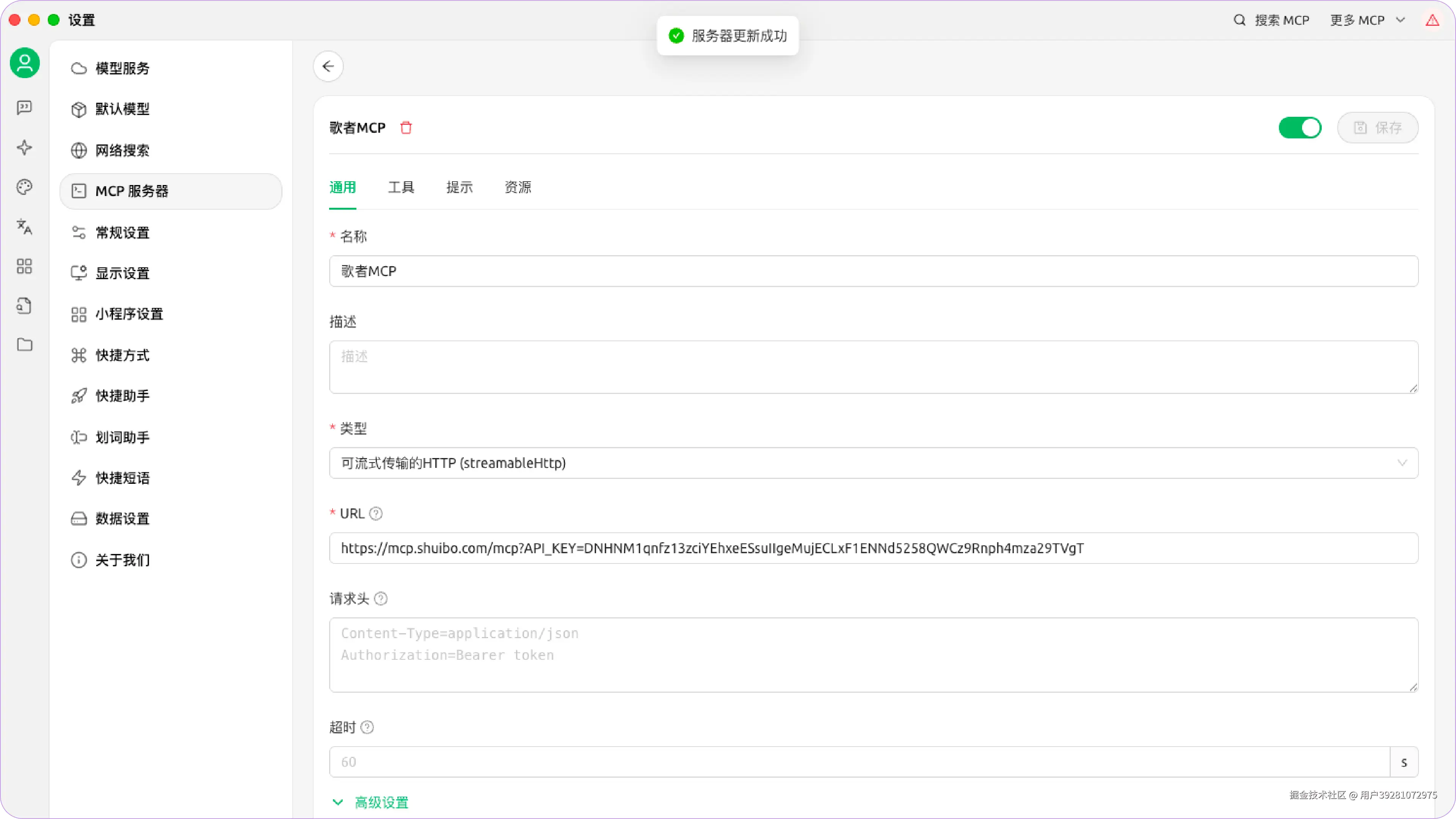 以下以 Cherry Studio 为例,说明如何快速添加歌者 MCP 服务: