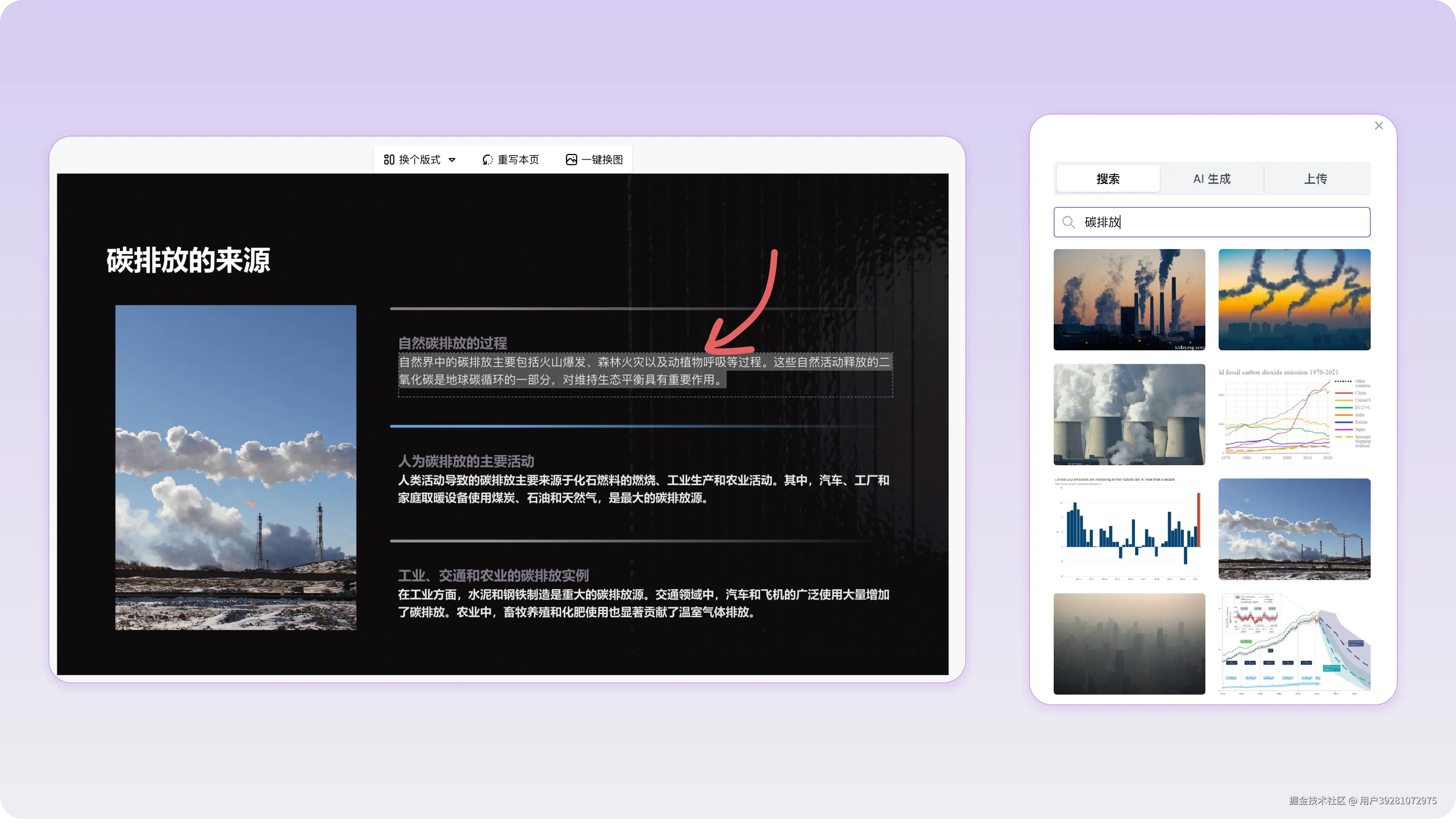 支持在线修改文字内容和调整字号、字体、颜色等;同时,配图也可灵活替换,在侧边栏中搜索新图,一键替换。