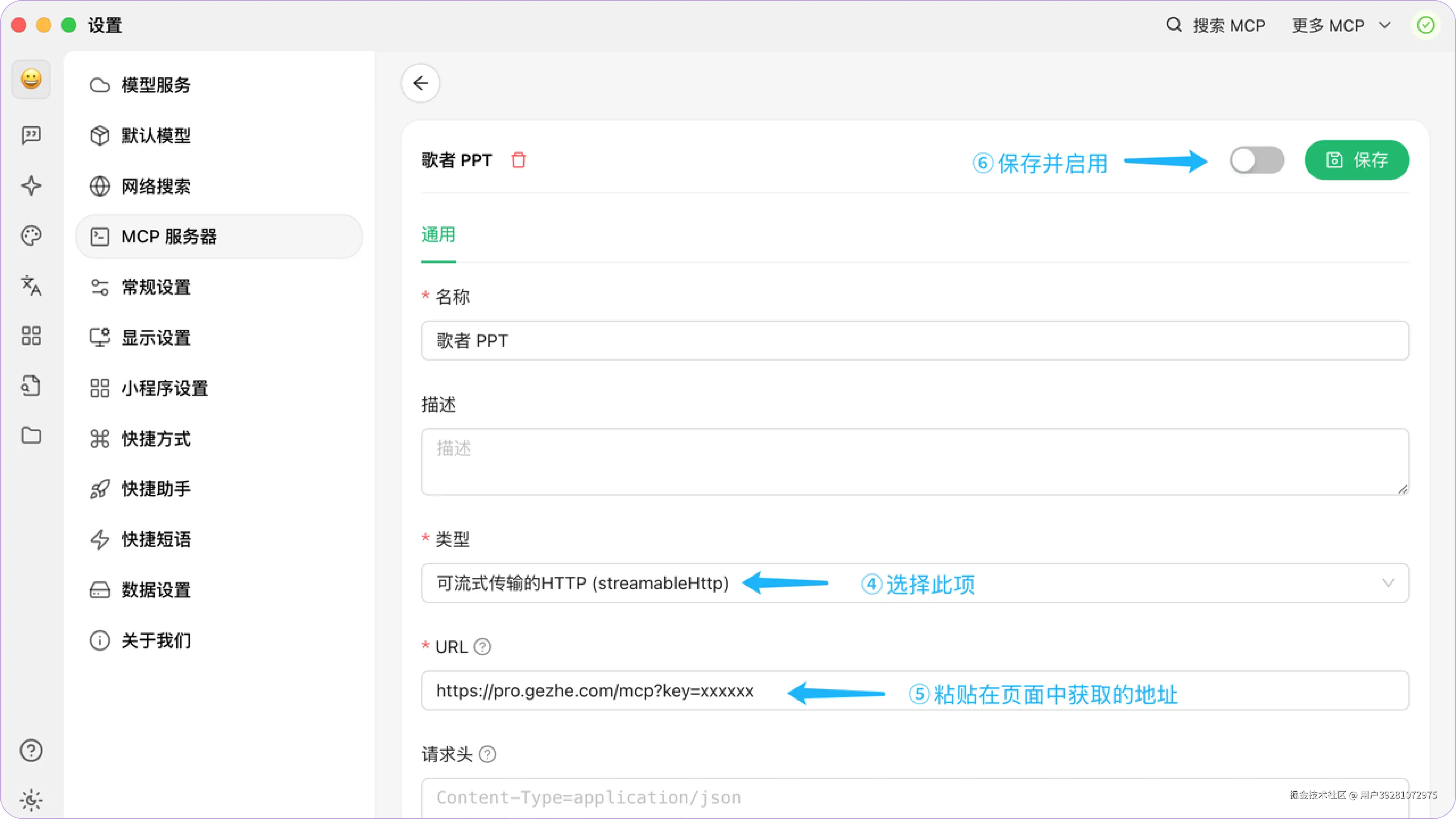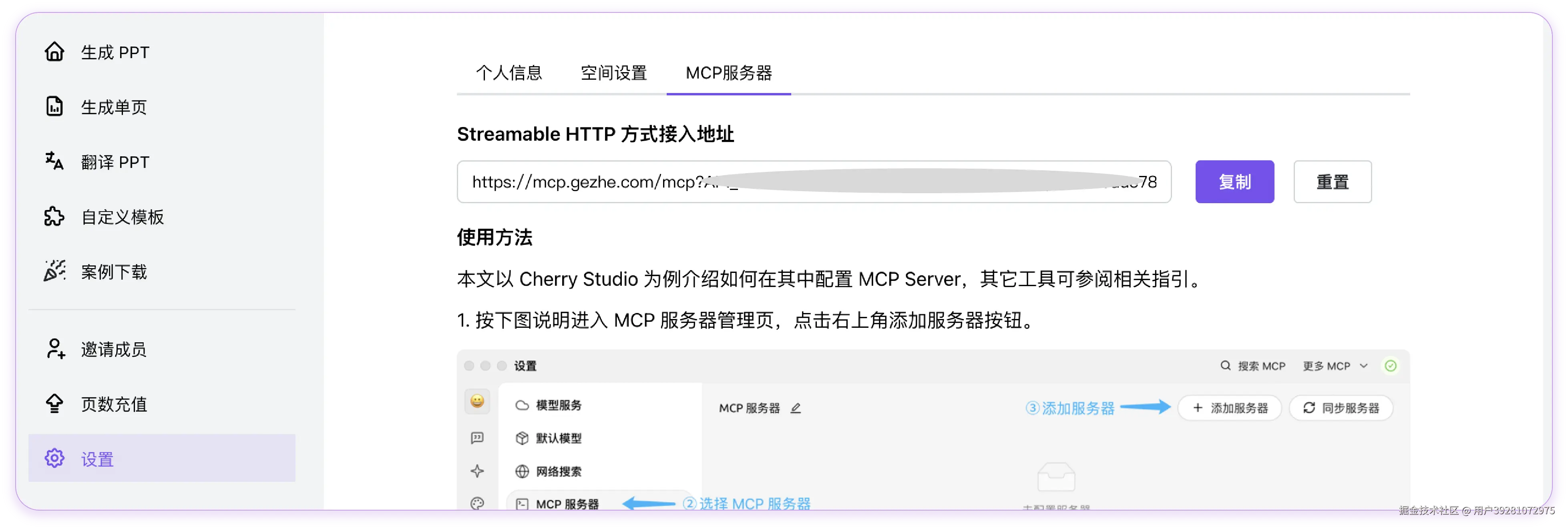 1. 访问并登录 gezhe.com,找到「设置」>「MCP 服务器」,获取歌者的 MCP 服务 URL,复制 URL 中末尾 API_KEY 的值