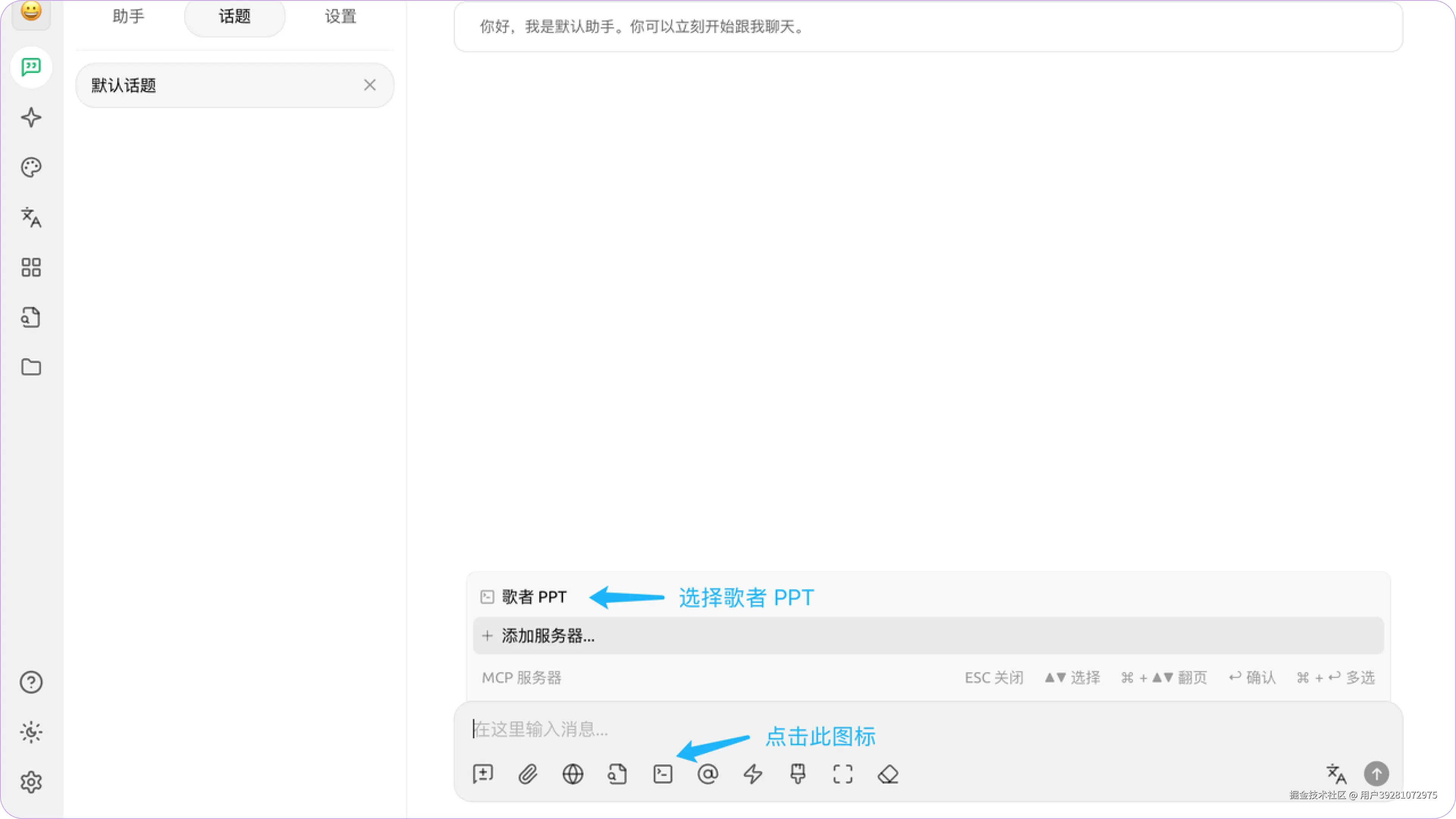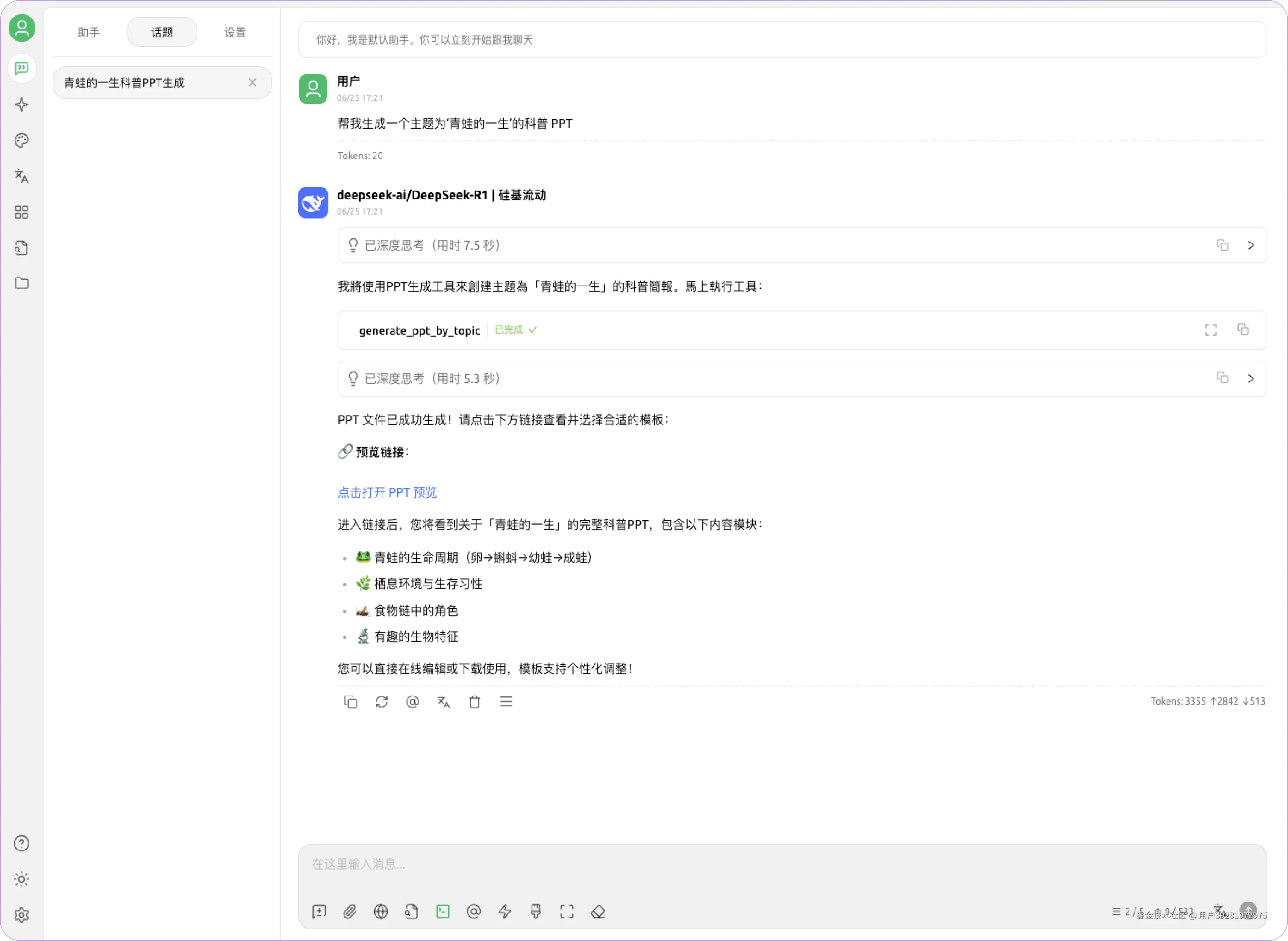 4. 回到对话界面,点击工具栏中的「MCP 服务器」图标,启用歌者服务,输入请求指令即可使用。例如:“帮我生成一个主题为‘青蛙的一生’的科普 PPT”