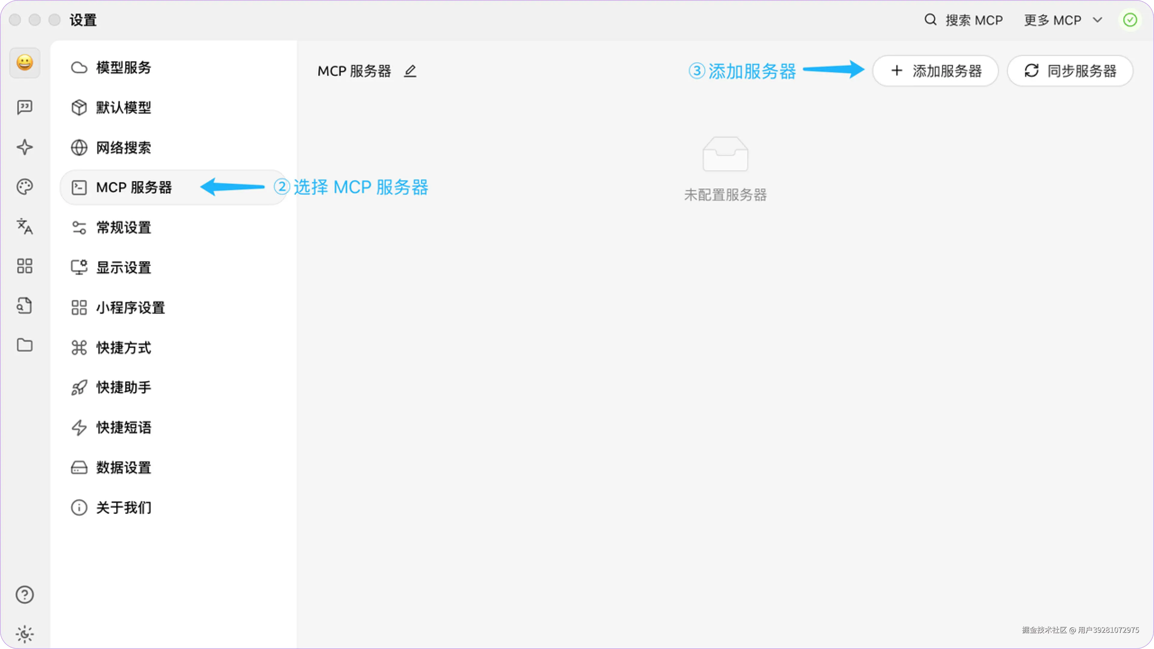 1. 访问并登录 gezhe.com,找到「设置」>「MCP 服务器」,获取歌者的 MCP 服务 URL