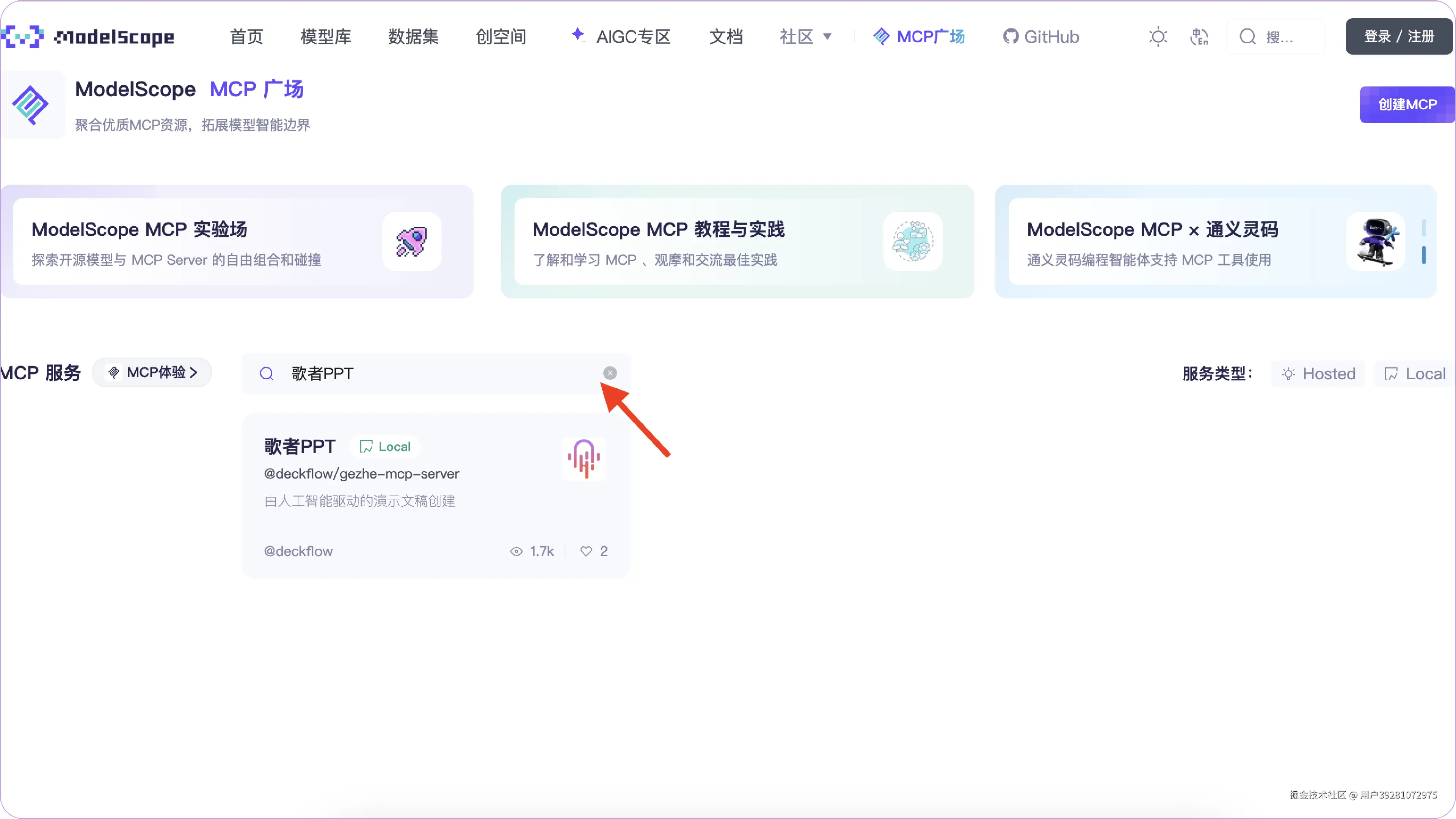 2. 在 mcp.so、魔搭社区 Modelscope 等 MCP 广场中搜索 「歌者 PPT」 ,获取 Server Config