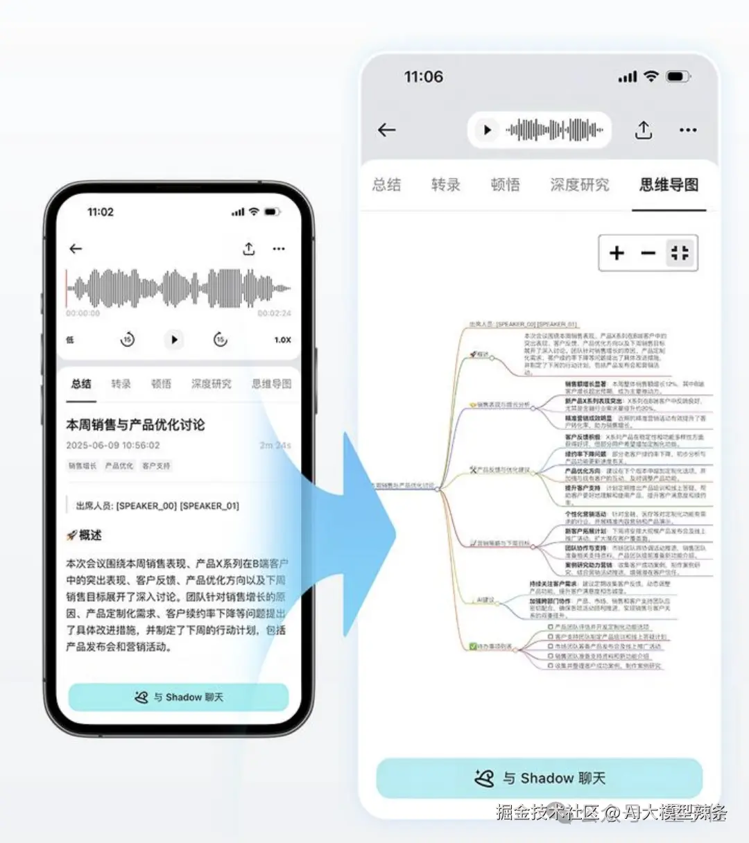 Shadow AI可以对录音转写进行内容提炼、总结,生成摘要的同时还能提取录音中提到的待办事项,并给出行动建议。