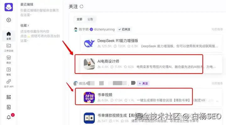 白杨SEO说下,如果你自己实在不会,你可以先去找下朋友工作流啥的,或者在某宝或某鱼找人做一个也不贵,是不?我在看官方推荐,居然看到了之前参加白杨SEO搜一搜SEO宇明的AI电商设计师那个,刚关注了,如图: