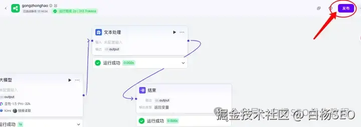 2、发布上线 :测试通过后,点击工作流编辑区右侧工具栏中的 “发布” 按钮,将工作流发布上线,使其可供实际使用。