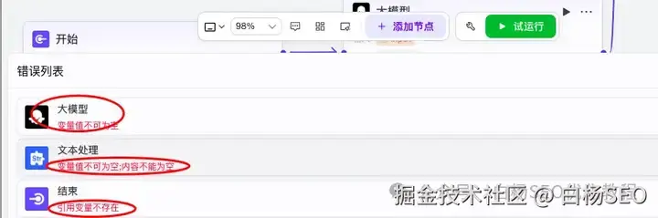 6)检查与调整:完成工作流的搭建后,仔细检查各个节点的配置和连接关系,确保工作流的逻辑正确、流程顺畅。如果出现红字如下面,说明还没有配置好哈。