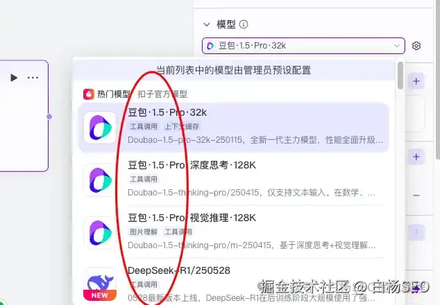 我们以 “大模型” 节点为例,需选择合适的大模型,设置模型参数,如温度值、最大Tokens 等,并编写清晰的系统提示词和用户提示词,以引导模型输出符合预期的结果;