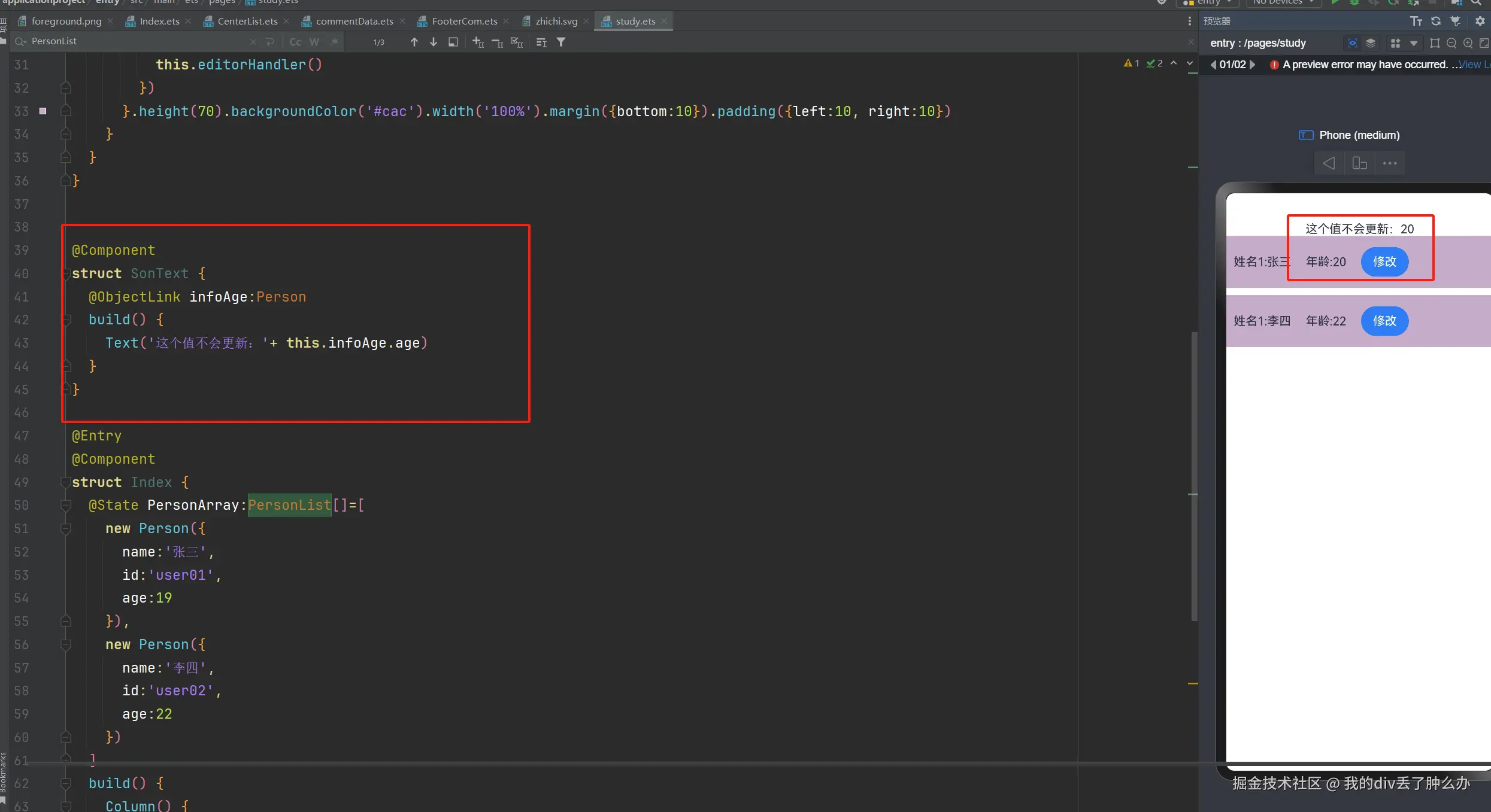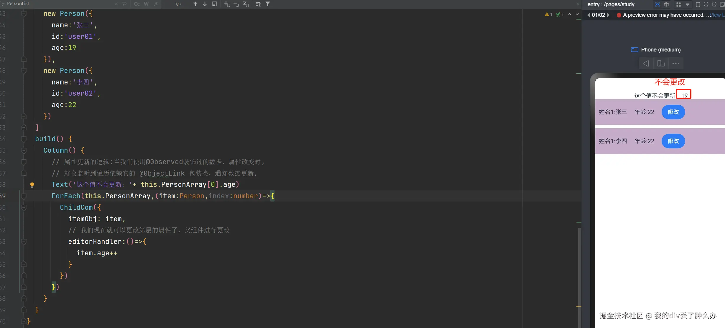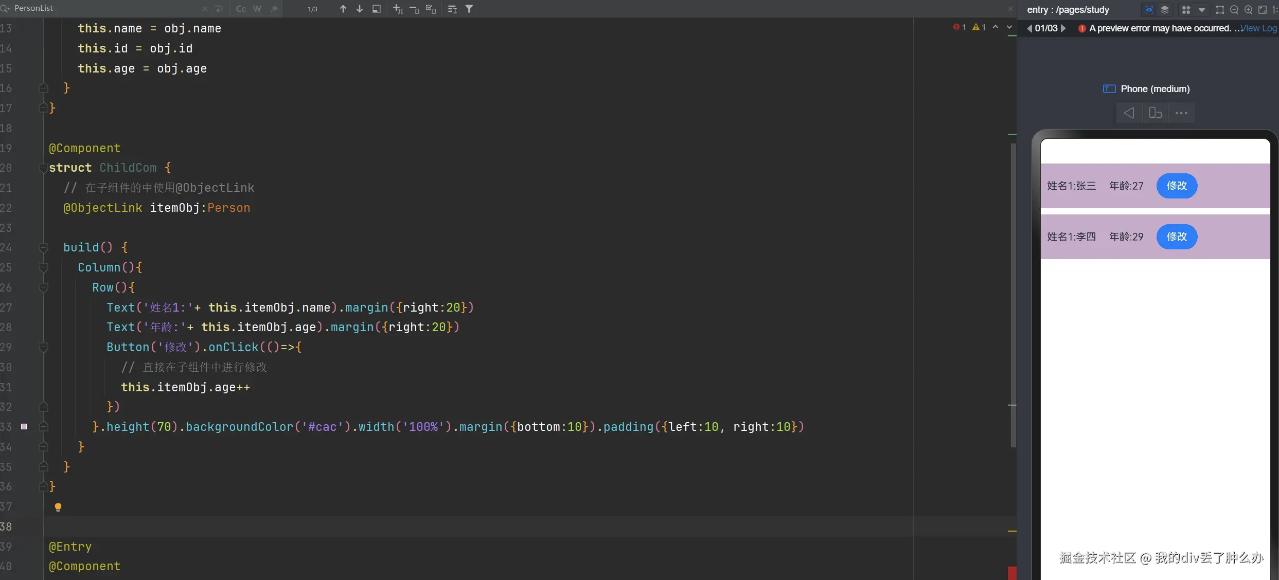 我们把 this.PersonArray[0].age 的数据值单独抽离成为一个组件。 原因是:@ObjectLink修饰符不能用在 Entry 修饰的组件中使用