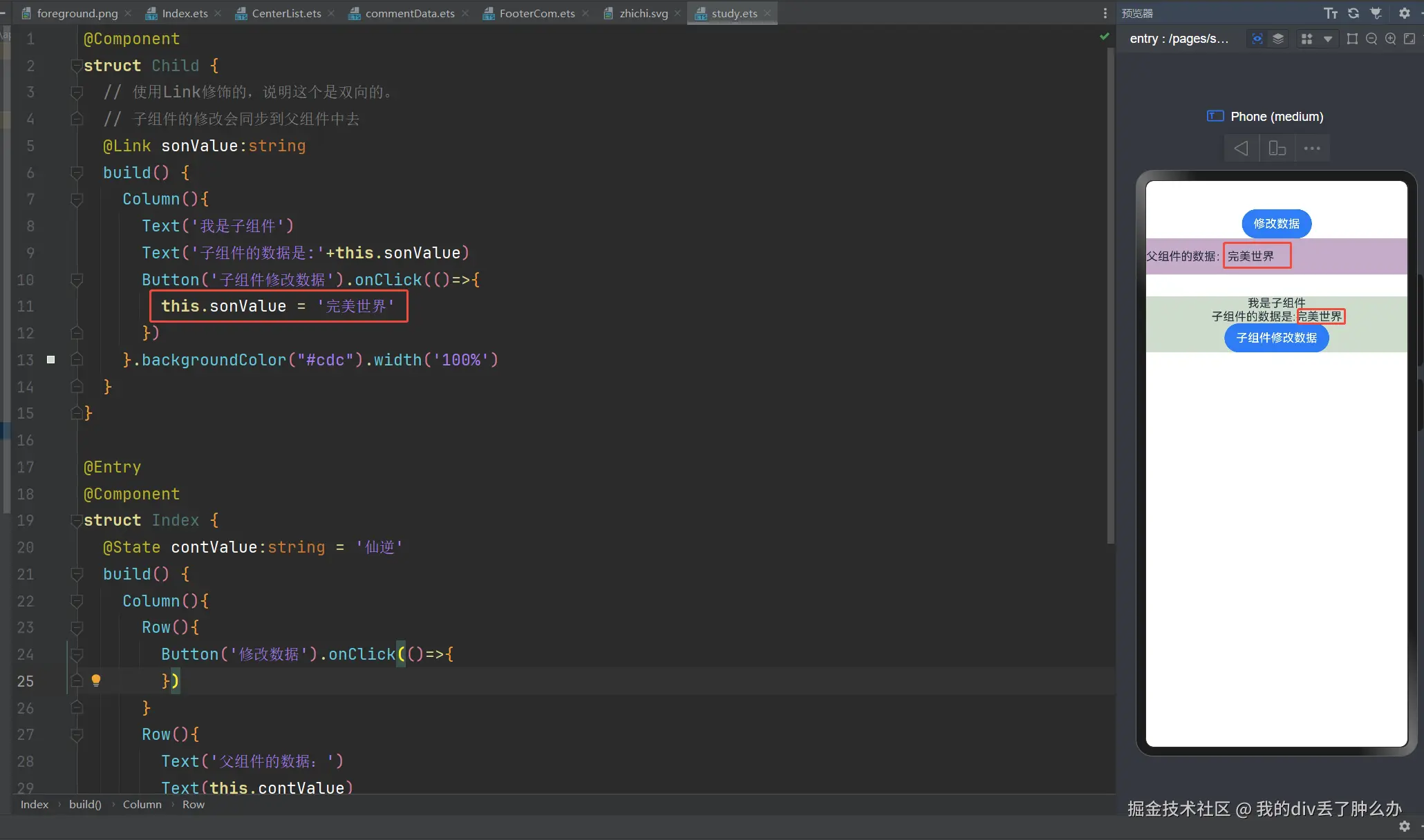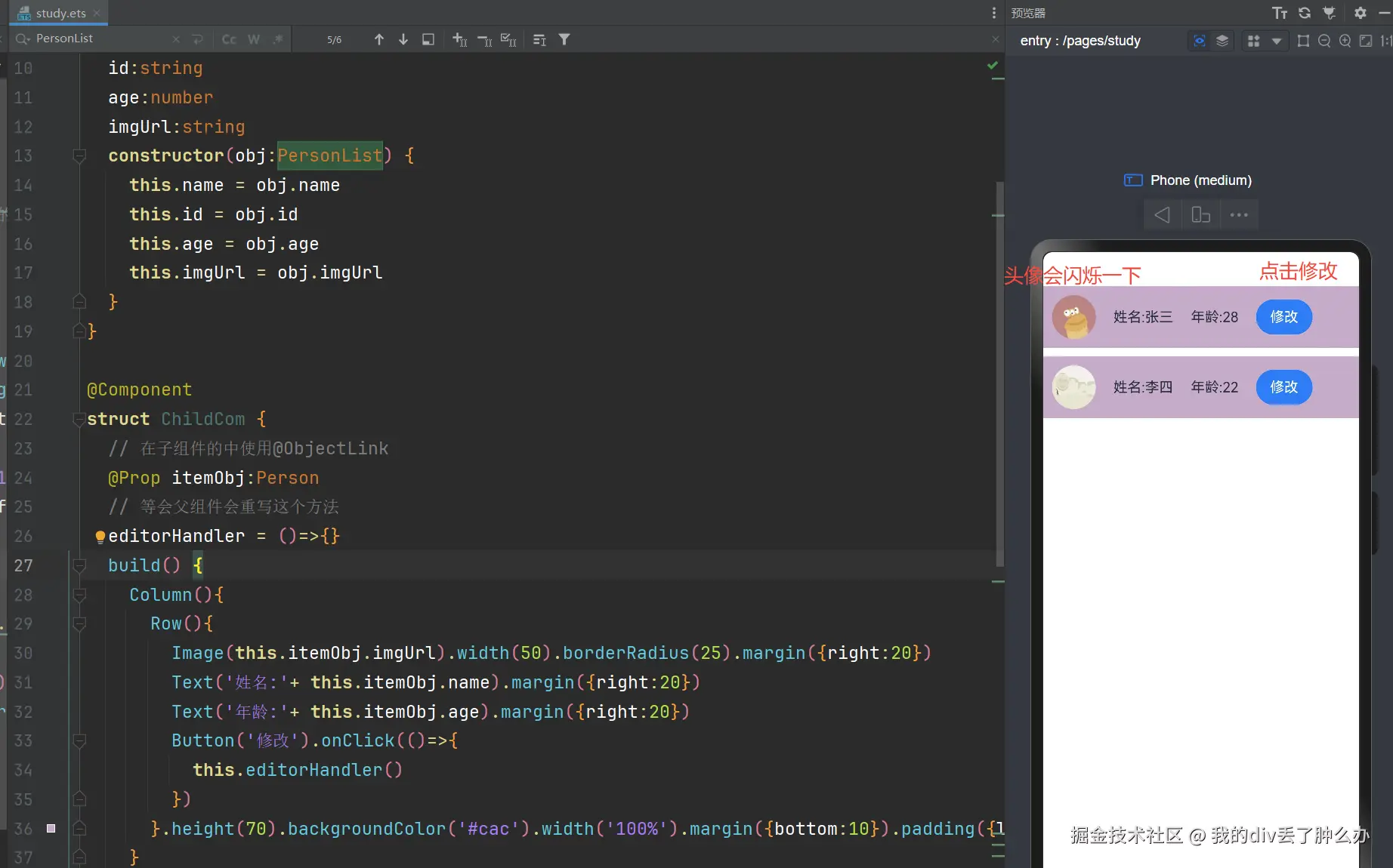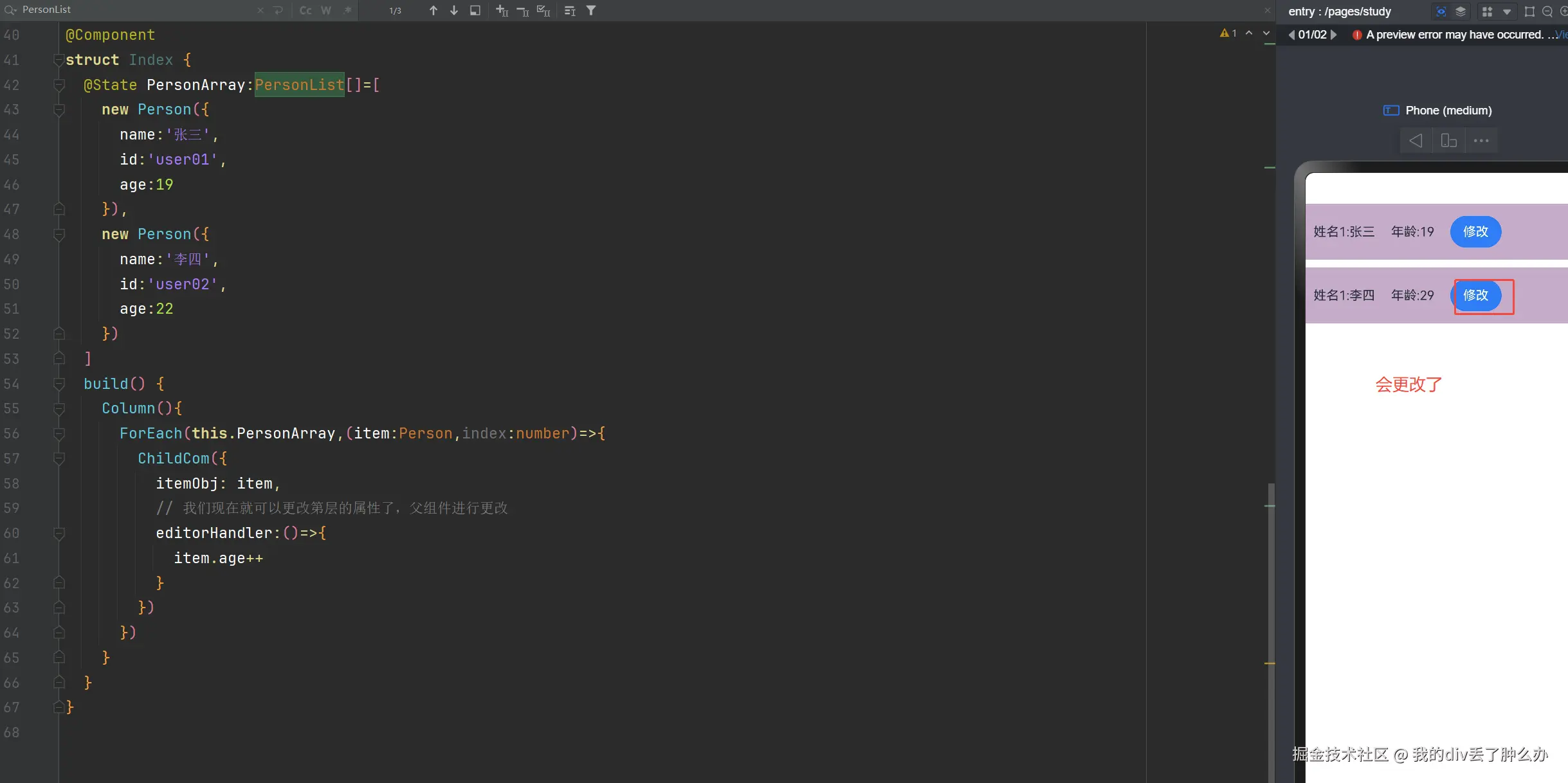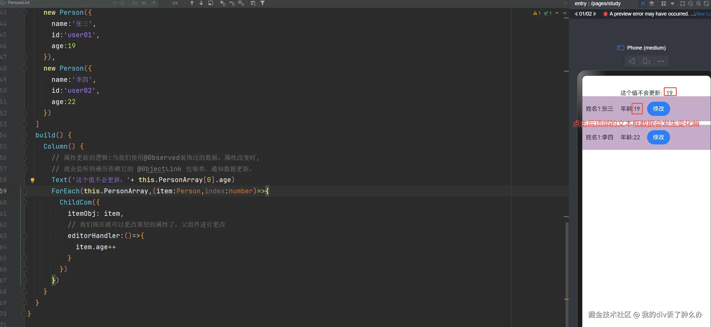 我们把 this.PersonArray[0].age 的数据值单独抽离成为一个组件。 原因是:@ObjectLink修饰符不能用在 Entry 修饰的组件中使用
