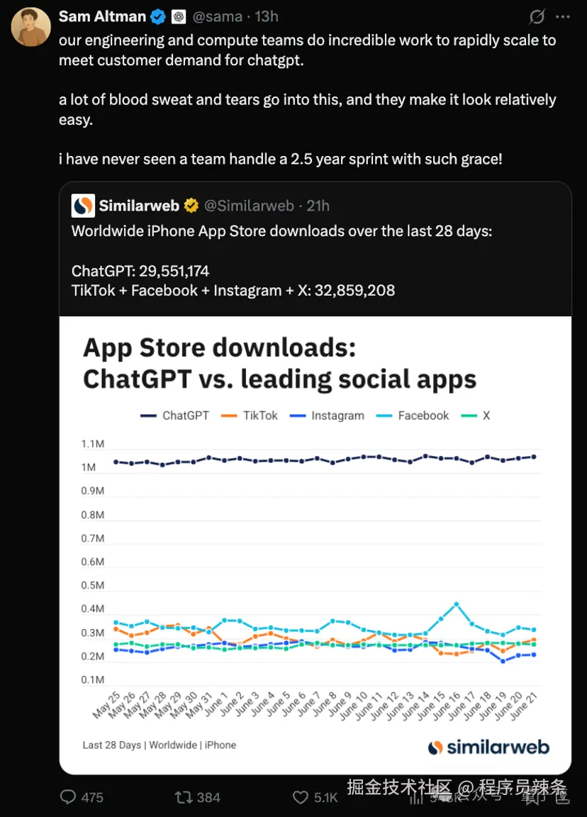 这两天,奥特曼转发了他们ChatGPT的一项战绩,移动APP下载量远远超过其他社交平台。