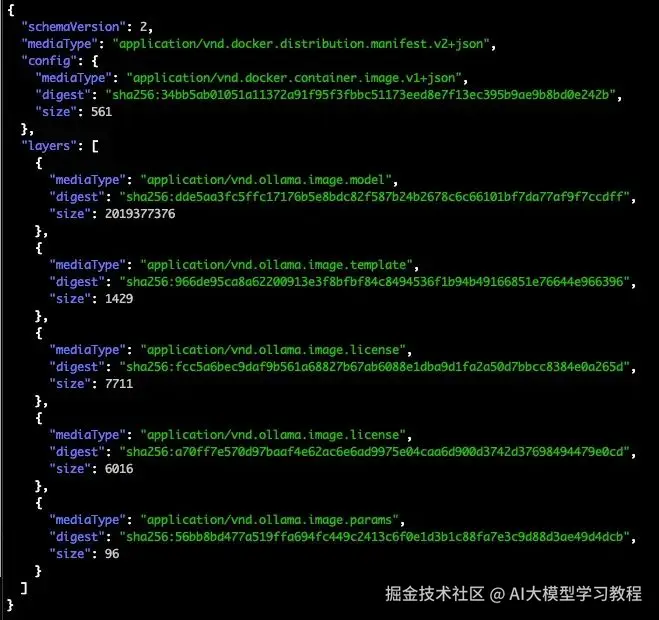 例如,元数据文件 models/manifests/registry.ollama.ai/library/llama3.2/latest 的内容如下: