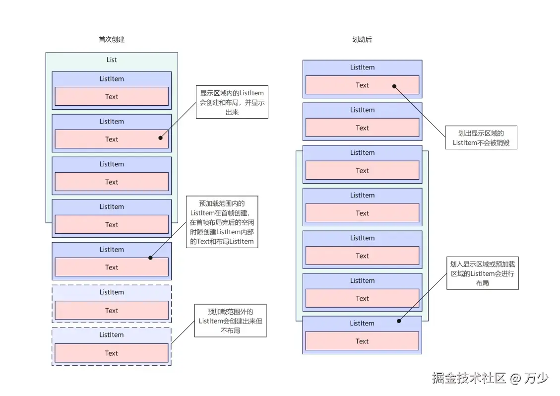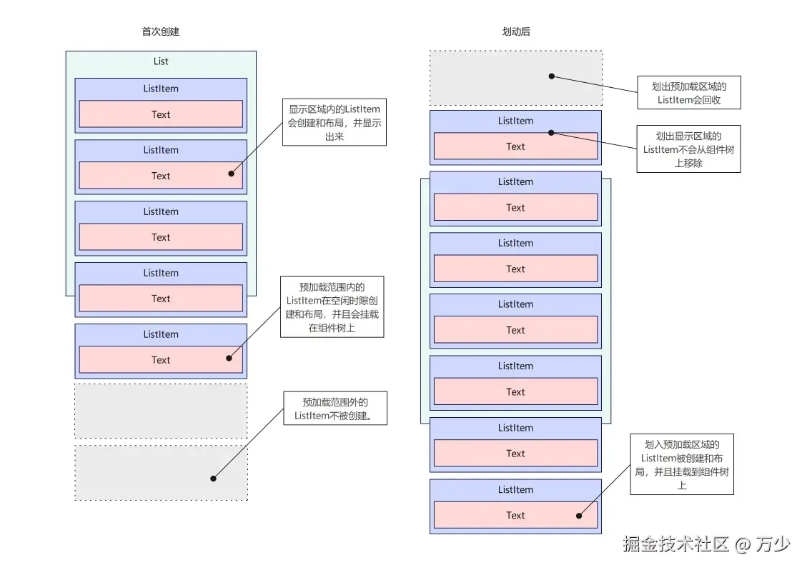 预加载区内的 ListItem 会在首帧创建,系统空闲时布局 ListItem 和创建 ListItem 内部的子结构