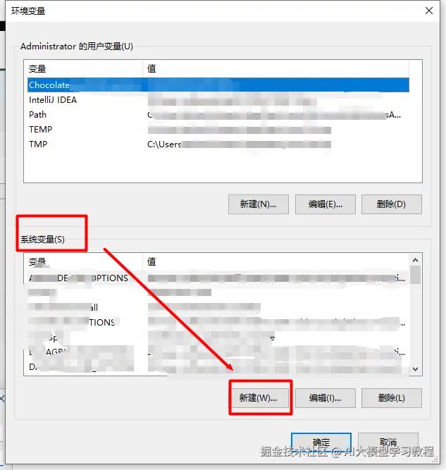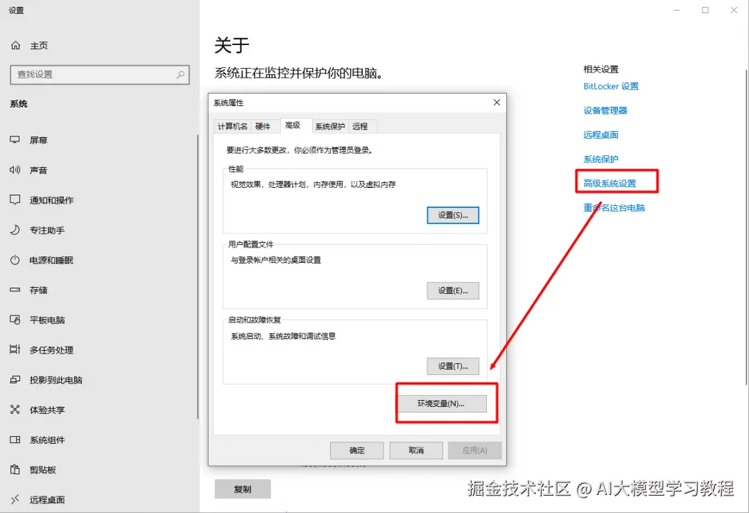 三、设置大模型的安装路径。如果不执行这一步的话,那么不久后你的C盘就会被你下载的各个大模型占满了。我的电脑右键 -> 属性 -> 系统 -> 高级系统设置 -> 环境变量