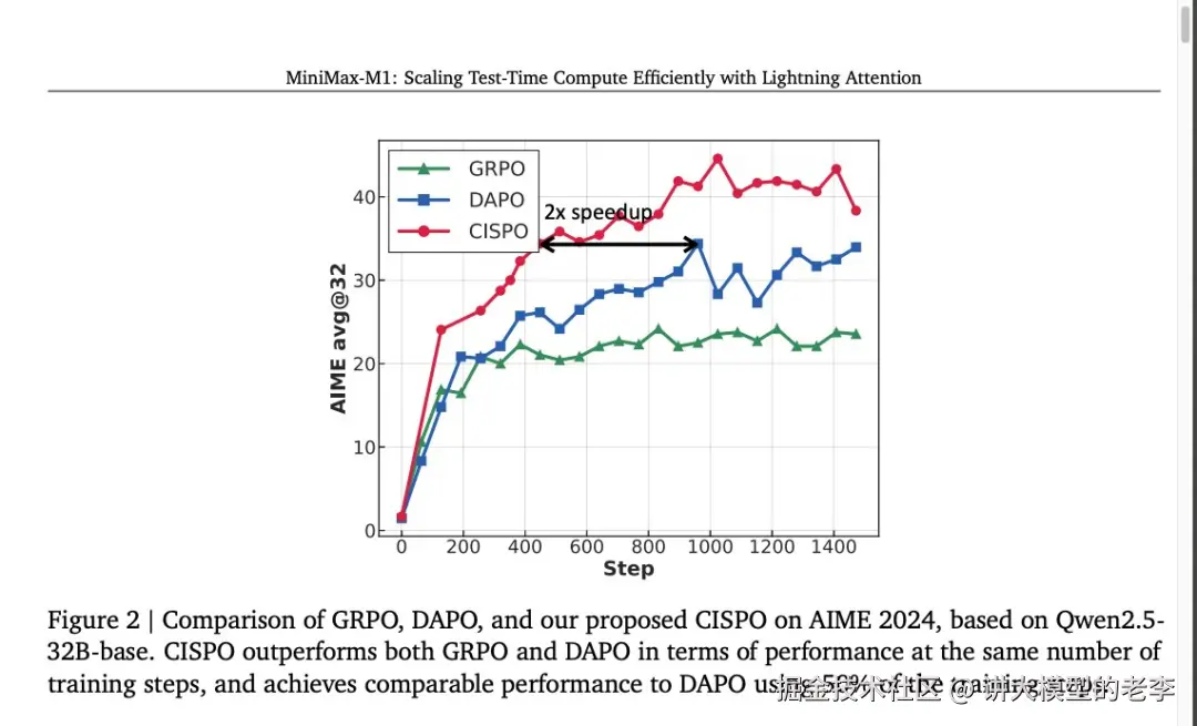 从结果看来,CISPO 比 字节的DAPO 和DeepSeek的GRPO这些优化方式都要快很多。