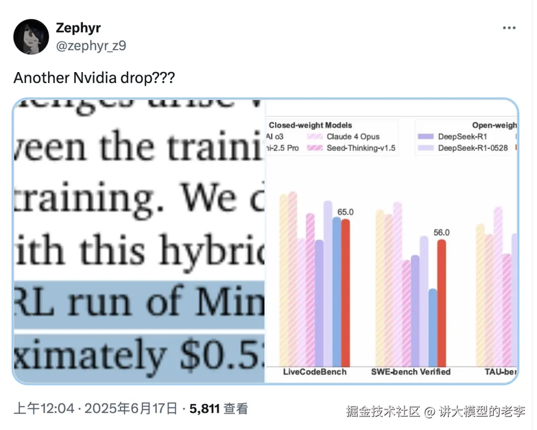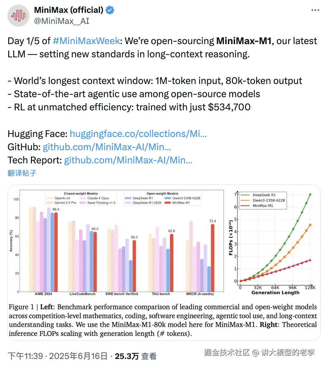 MiniMax不光以Apache协议开源了M1模型,还提供了M1模型的技术报告,链接在这里 github.com/MiniMax-AI/… ,看了之后,果然,优异的表现来自于不凡的技术突破。