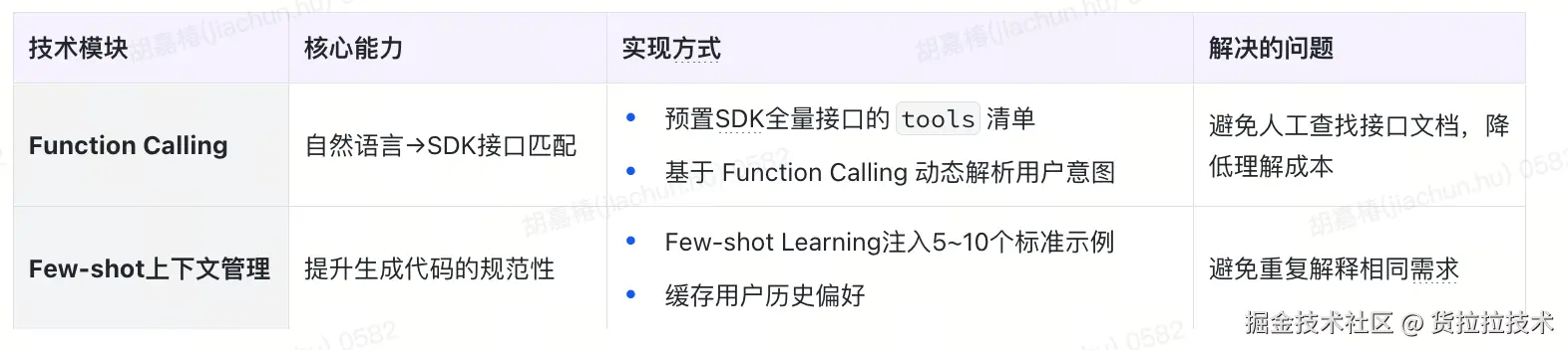 评估维度 DeepSeek Function Calling 传统正则匹配 开源NLP模型+规则引擎 核心能力 自然语言→SDK接口精准匹配 关键词触发固定代码片段 有限泛化能力,需持续维护规则库 实现复杂度 低(API直接调用) 中(需编写大量正则) 高(需训练+调优模型) 扩展成本 仅需更新 tools清单每新增接口需新增较多正则 需重新标注数据+微调模型 最终选型 ✅ 采用 ❌ 淘汰 ❌ 淘汰 - 上下文优化管理
