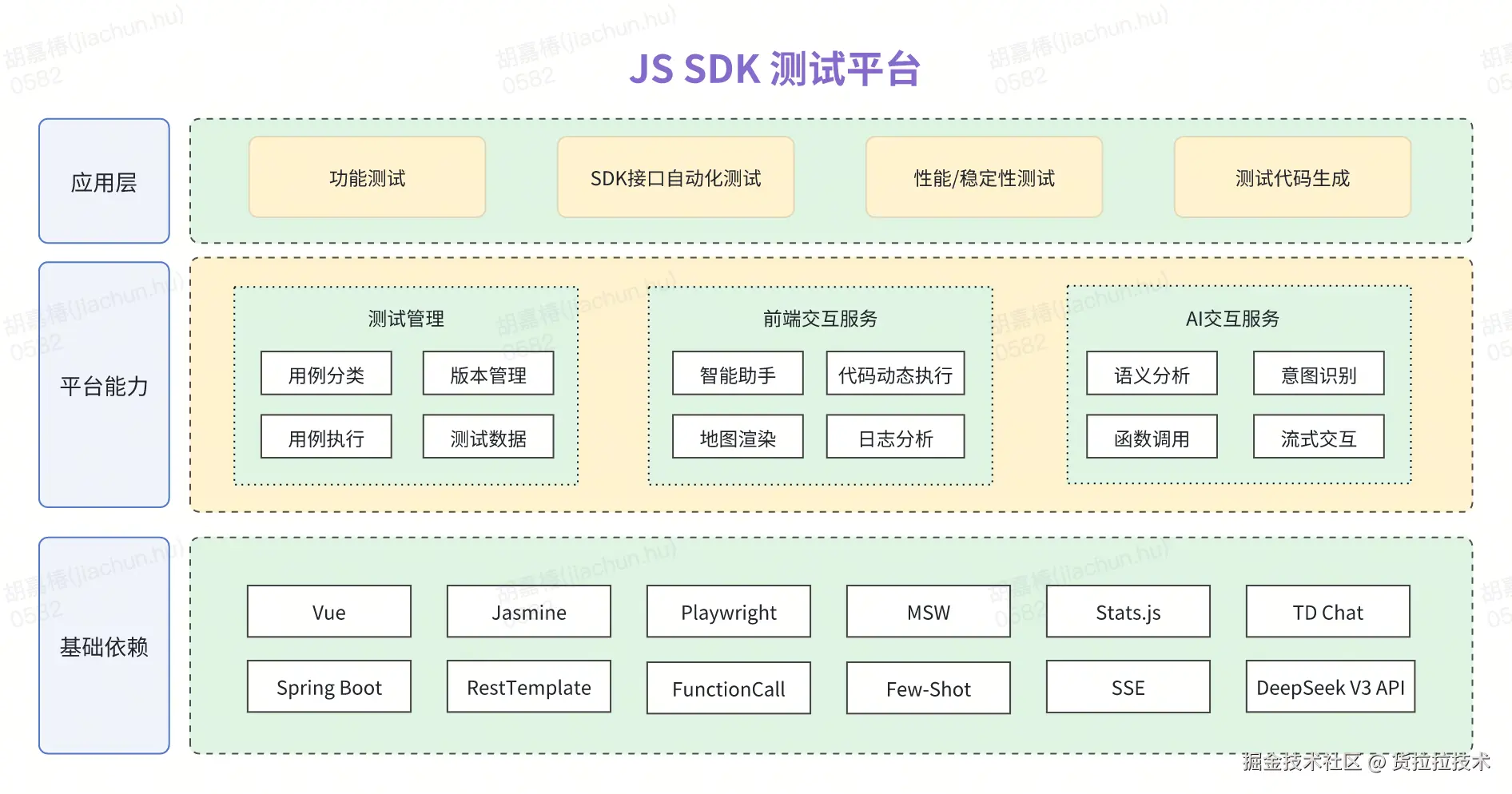 为系统性解决上述问题,我们聚焦全流程测试效能提升,搭建了JS SDK测试平台,通过分层设计与自动化能力集成,尝试为SDK测试构建更高效的测试方案,同时我们也尝试基于AI能力进行用例代码的生成,为测试能力的进一步提升探索方向。下文将详细拆解平台架构与功能逻辑 。