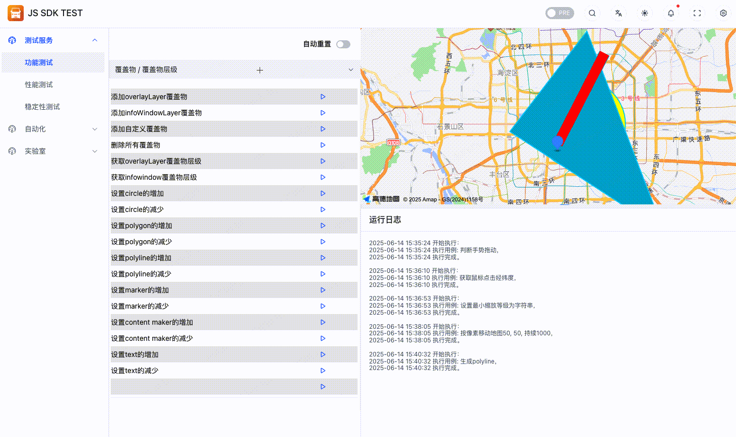 - 可支持JS SDK 7个大类 61个接口基础操作(图像渲染、覆盖物、事件监听等)用例代码生成。
