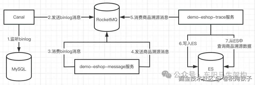 流程六: 商品中心的系统消费完binlog消息对应的变更数据消息后,会将消息编号发送到MQ中以外部消息的形式由商品消息系统去消费处理。