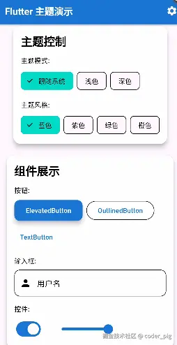 Theme (主题) 是Flutter中用来 统一管理应用视觉风格 的系统,即:让整个App的颜色、字体、按钮样式保持一致。好处是:便于维护 (一处修改,全局生效)、轻松实现全局主题切换。