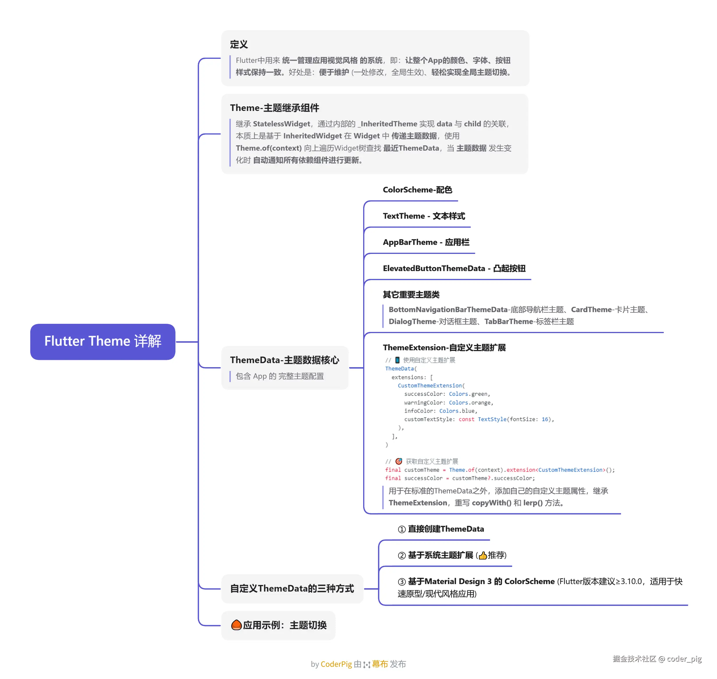 😄 公司APP 没有「深色模式」的需求,就一直没去了解 Flutter Theme,都是直接手写 Color,最近想给自己写的 开源APP-惜命 加个 APP主题切换,看AI生成的代码有点 别扭 (🤡完全不了解,觉得心里没底),索性自己花点时间系统学习下,本节主要内容如下: